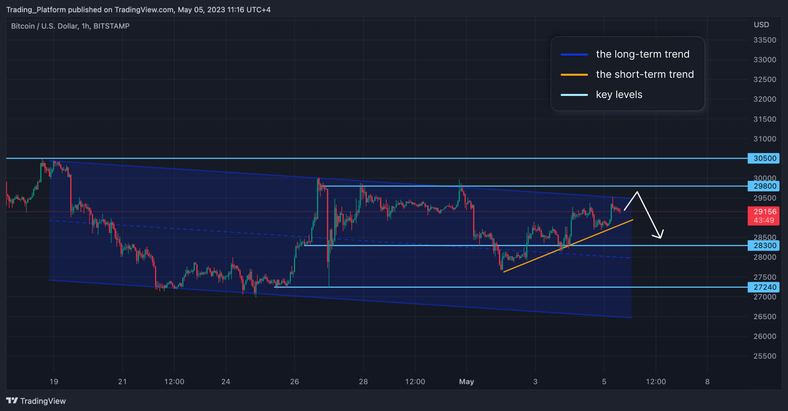 Bitcoin (BTC/USD): Tato kryptoměna je na 1hodinovém grafu v dlouhodobém klesajícím trendovém kanálu a krátkodobě jsme v rostoucím trendu. Cena konsoliduje u klíčové hladiny 29800, což je horní linie klesajícího kanálu. Při nevydařeném proražení nad tuto hladinu bychom mohli oslabit k hladině 28300. Dokud jsme pod hladinou 29800, mohli bychom hledat short příležitosti.