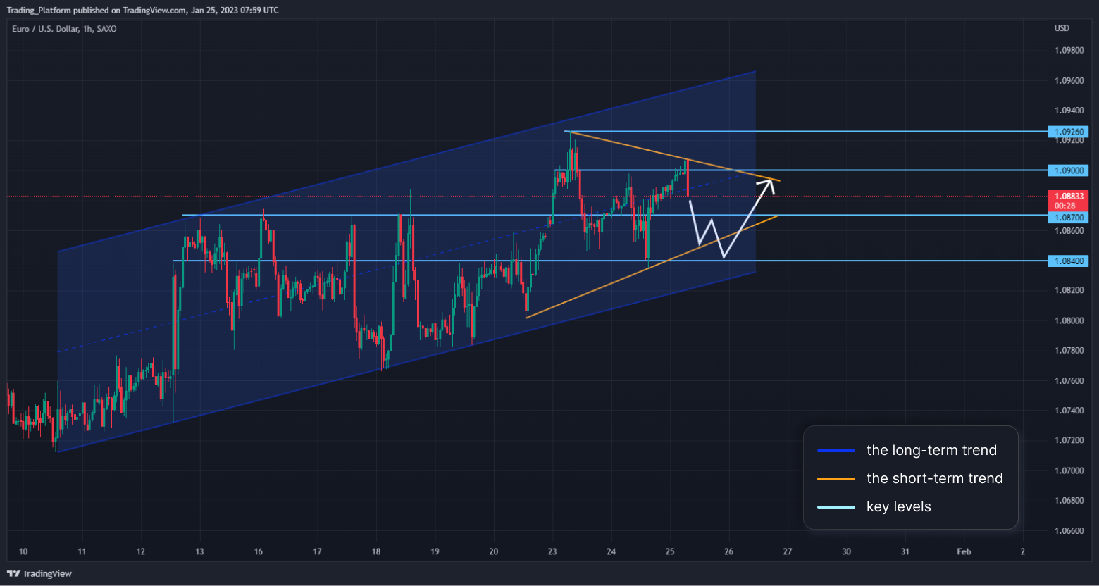 EUR/USD: Tento měnový pár je na 1hodinovém grafu v dlouhodobém rostoucím trendovém kanálu, krátkodobě jsme v konsolidaci u silné rezistence. Cena by mohla korigovat k hladině 1,0840 při oslabování z hladiny 1,0926. U spodní linie kanálu se ale zřejmě objeví kupci a mohli bychom opět otestovat maxima. Dokud jsme nad hladinou 1,0840, mohli bychom hledat long příležitosti.