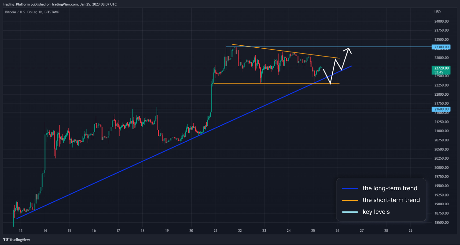 Bitcoin (BTC/USD): Tato kryptoměna je na 1hodinovém grafu v dlouhodobém rostoucím trendu, krátkodobě jsme v klesajícím trojúhelníku. Cena je neutrální v pásmu 22300 – 23300 a jeho proražení naznačí další směr. Očekáváme proražení vzhůru a otestování maxim. Pouze prolomení pod 22250 by přerušilo býčí trend. Dokud jsme nad hladinou 22200, mohli bychom hledat long příležitosti.