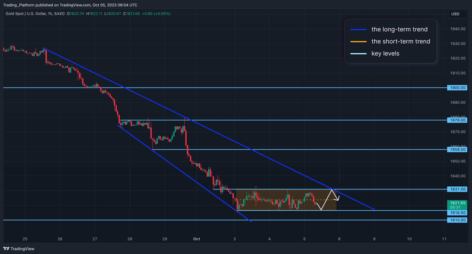 Zlato (XAU/USD): Tato komodita je na 1hodinovém grafu v dlouhodobém klesajícím trendovém kanálu, krátkodobě jsme v úzkém pásmu. Cena klesla pod hladinu 1831 a obchoduje v trendovém kanálu. Nyní bychom mohli obchodovat v pásmu 1816 – 1831 a jeho proražení naznačí další směr. Dokud jsme pod hladinou 1858, mohli bychom hledat short příležitosti.