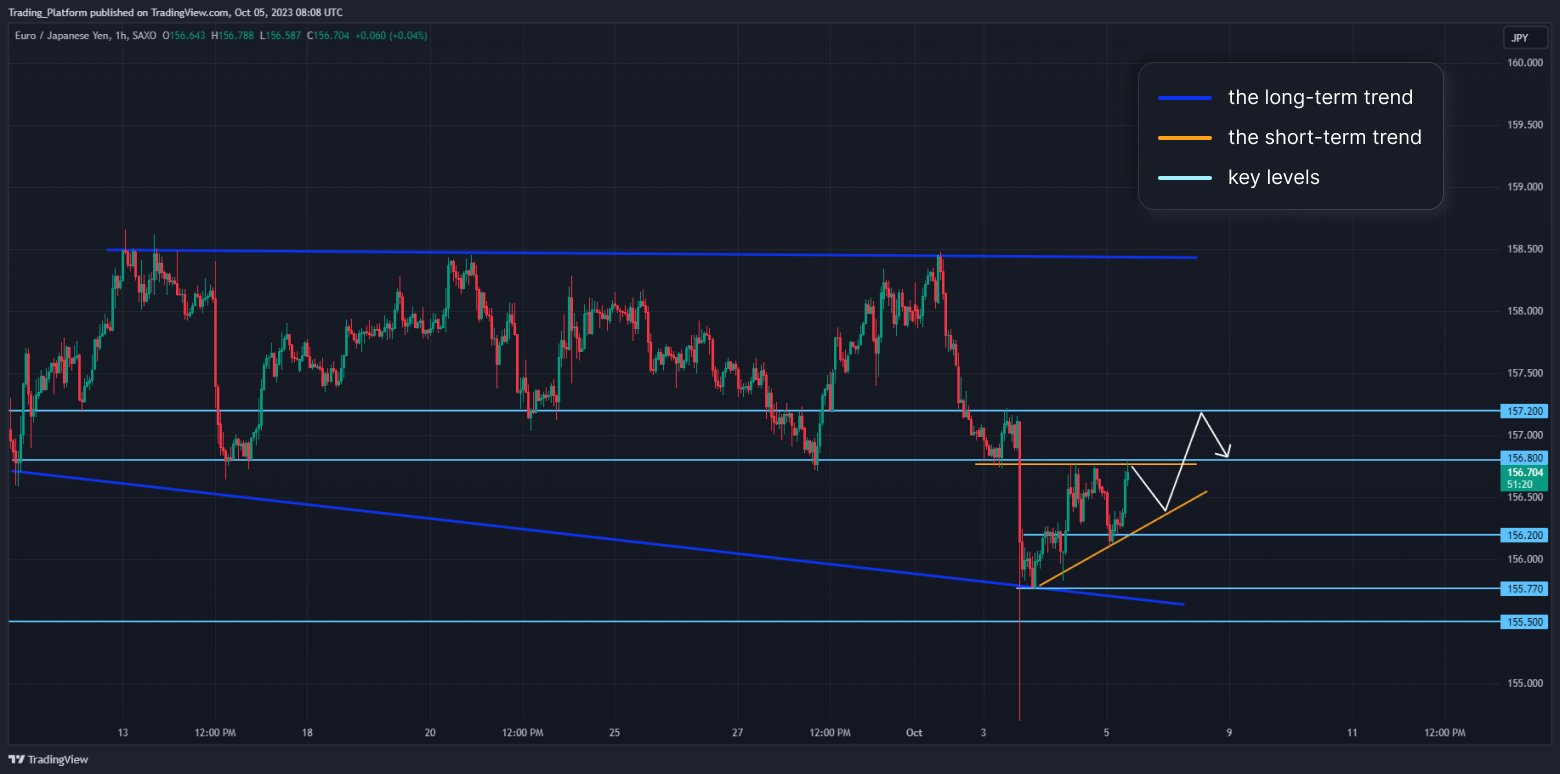 EUR/JPY: Tento měnový pár je na 1hodinovém grafu v dlouhodobém pohybu do strany, krátkodobě jsme v rostoucím trojúhelníku. Cena je neutrální v pásmu 156,20 – 158,80 a jeho proražení naznačí další směr. Nyní bychom mohli obchodovat v pásmu s mírnou převahou prodejců. Dokud jsme pod hladinou 157,20, mohli bychom hledat short příležitosti.