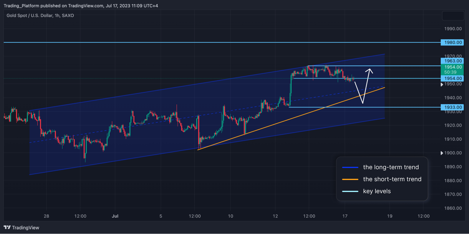Zlato (XAU/USD): Tato komodita je na 1hodinovém grafu v dlouhodobém rostoucím trendu, krátkodobě jsme v klesajícím trendovém kanálu. Cena konsoliduje u silného supportu 1935 a jeho prolomení by otevřelo cestu k důležitému supportu 1914, kde by mohl stoupnout nákupní tlak. Dokud jsme nad hladinou 1914, mohli bychom hledat long příležitosti.