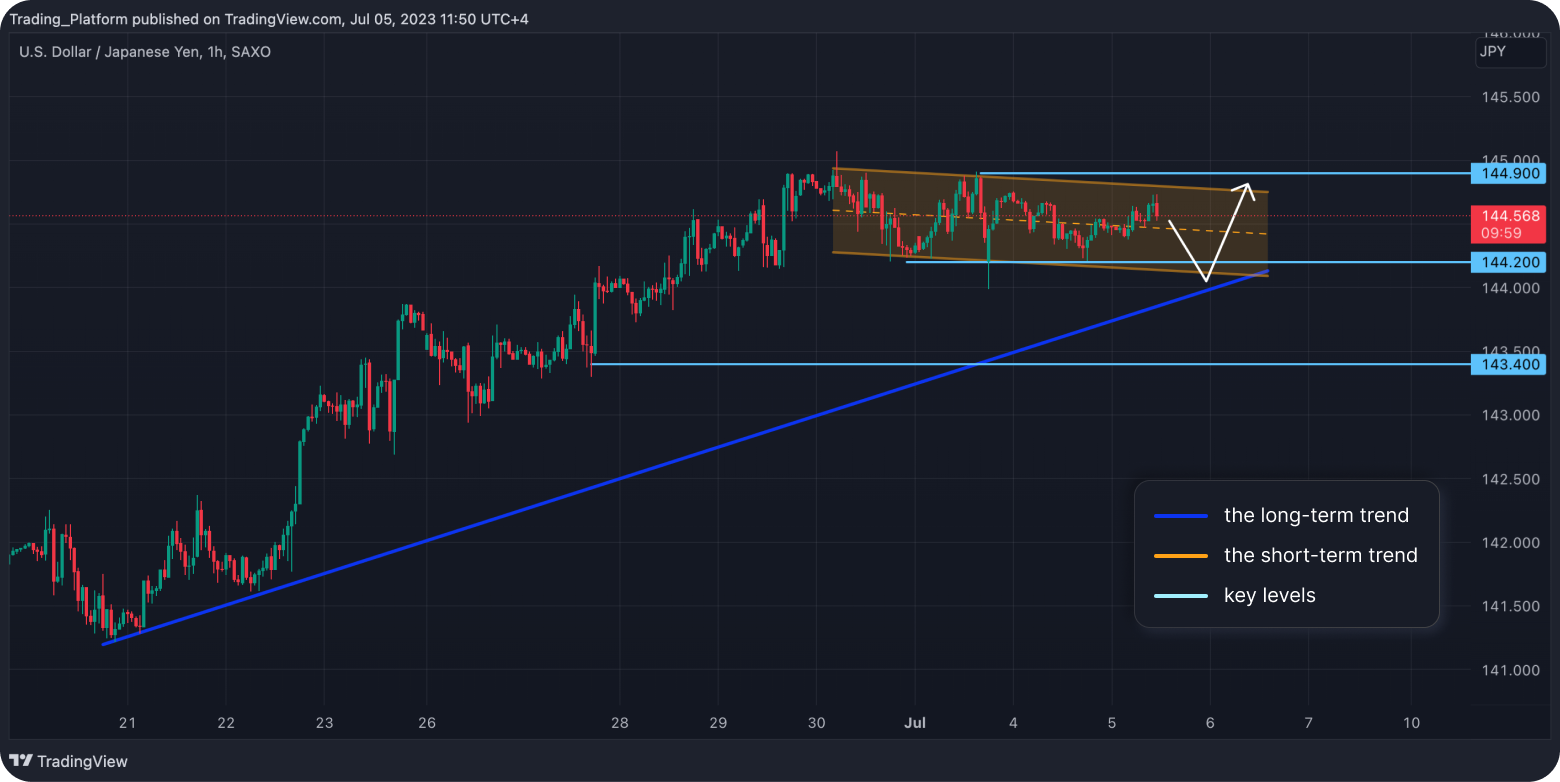 USD/JPY: Tento měnový pár je na 1hodinovém grafu v dlouhodobém rostoucím trendu a krátkodobě jsme v klesajícím trendovém kanálu. Cena je neutrální v pásmu 144,20 – 144,90 a jeho proražení naznačí další směr. Nyní bychom mohli obchodovat do strany. Pak bychom mohli korigovat k trendové čáře u 144,20 a opět růst. Dokud jsme nad hladinou 143,40, mohli bychom hledat long příležitosti.
