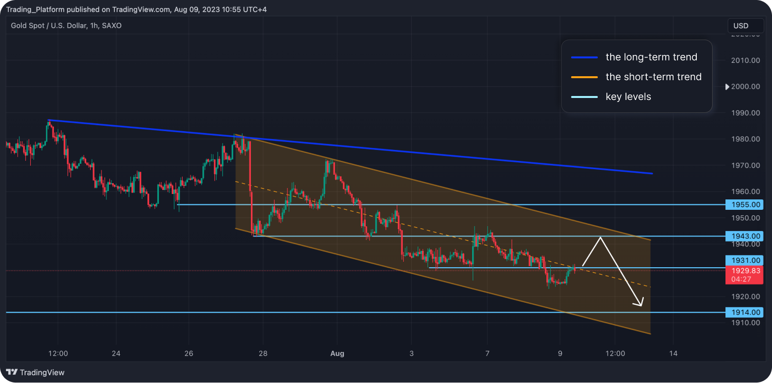 Zlato (XAU/USD): Tato komodita je na 1hodinovém grafu v dlouhodobém klesajícím trendu, krátkodobě jsme v klesajícím trendovém kanálu. Cena konsoliduje u klíčové hladiny 1931. Nyní bychom mohli korigovat k horní linii kanálu u 1943 a pak opět klesat. Dokud jsme pod hladinou 1955, mohli bychom hledat short příležitosti.
