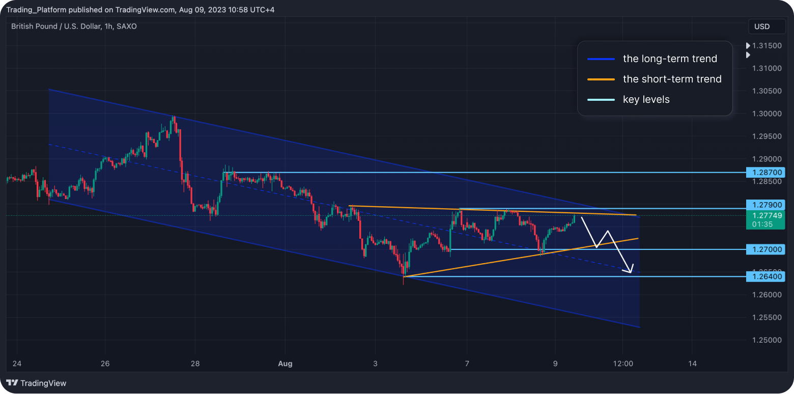 USD/JPY: Tento měnový pár je na 1hodinovém grafu v dlouhodobém rostoucím trendovém kanálu a krátkodobě jsme v klesajícím trendovém kanálu. Cena se odrazila od horní linie kanálu na 143,50. Nyní bychom mohli korigovat k hladině supportu 141,50, kde by mohl stoupnout nákupní tlak. Dokud jsme nad hladinou 140,20, mohli bychom hledat long příležitosti.