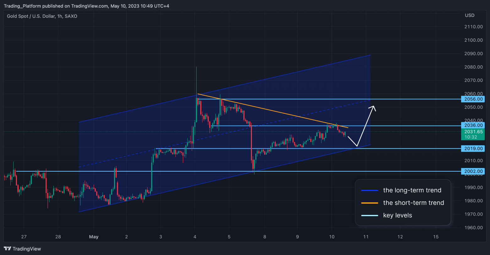 Zlato (XAU/USD): Tato komodita je na 1hodinovém grafu v dlouhodobém rostoucím trendovém kanálu, krátkodobě jsme v klesajícím trendu. Cena čelí silné rezistenci na 2036. Nyní bychom mohli korigovat k supportu 2019, kde by mohl stoupnout nákupní tlak. Dokud jsme nad hladinou 2002, mohli bychom hledat long příležitosti.