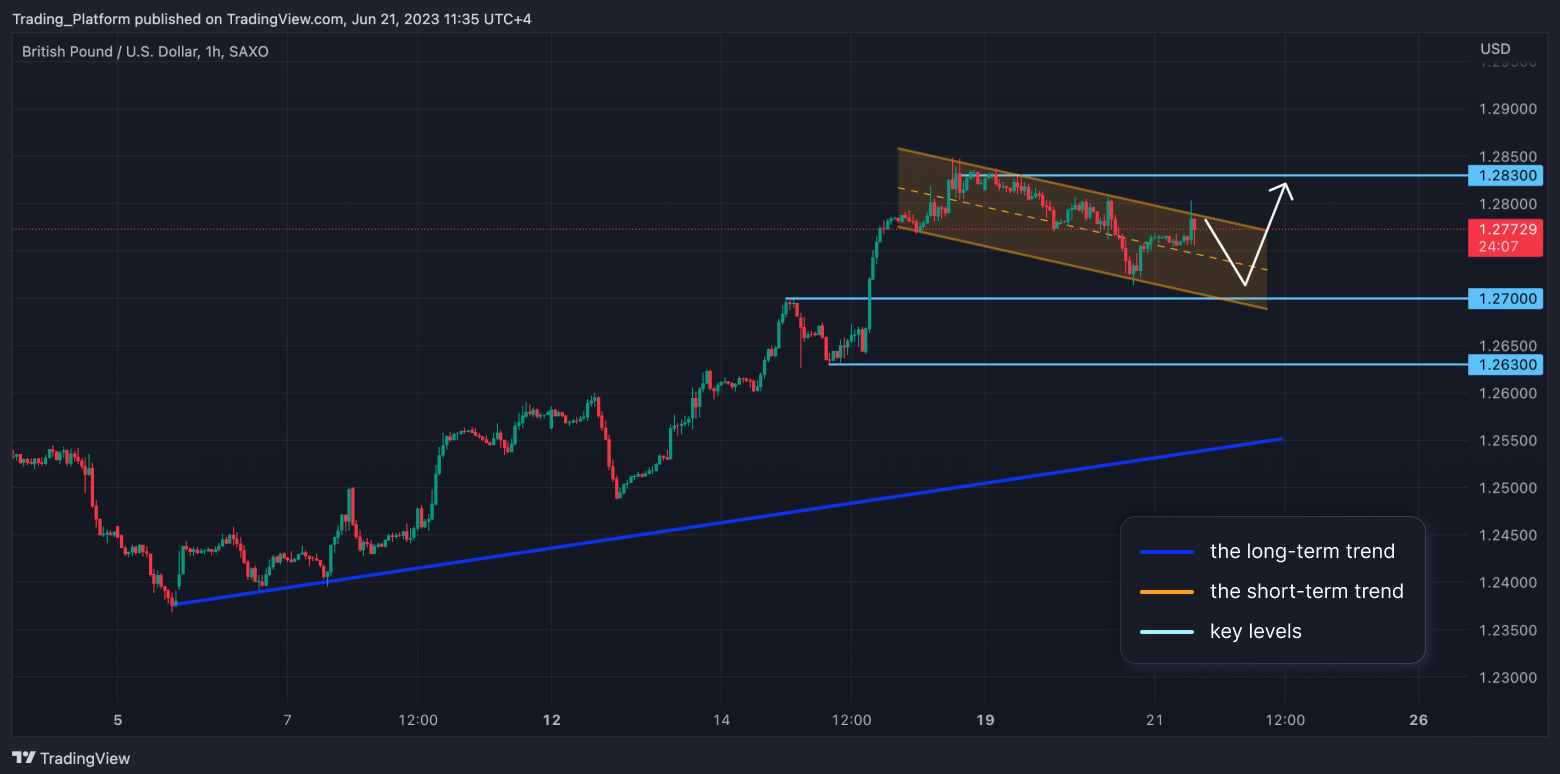 USD/JPY: Tento měnový pár je na 1hodinovém grafu v dlouhodobém klesajícím trendu a krátkodobě jsme v rostoucím trendovém kanálu. Cena konsoliduje u silné rezistence 142,10. Nyní bychom mohli korigovat ke spodní linii kanálu u 141,20, kde by mohl stoupnout nákupní tlak. Ovšem jasné prolomení pod 141,20 by otevřelo cestu k hladině 140,00. Dokud jsme nad hladinou 140,00, mohli bychom hledat long příležitosti.