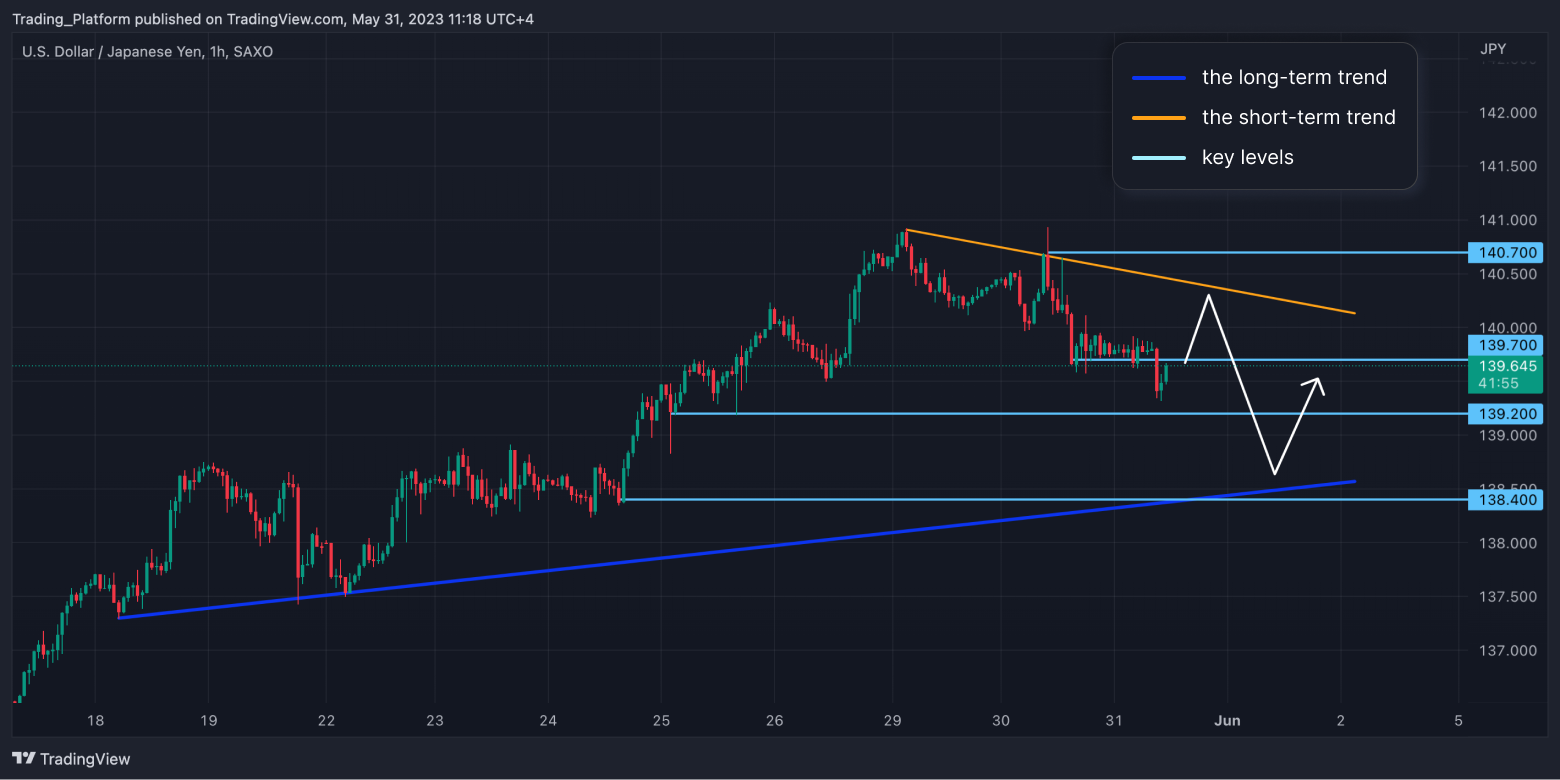 USD/JPY: Tento měnový pár je na 1hodinovém grafu v dlouhodobém rostoucím trendu a krátkodobě jsme v klesajícím trendu. Cena prolomila klíčovou hladinu 139,70, ale medvědí momentum slábne. Nyní bychom mohli otestovat klesající trendovou čáru a pak opět klesat k silnému supportu 138,40, kde by mohl stoupnout nákupní tlak. Dokud jsme nad hladinou 138,40, mohli bychom hledat long příležitosti.