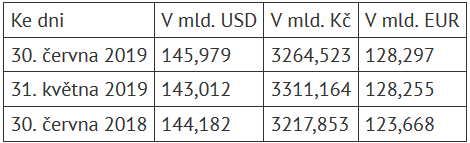 V amerických dolarech devizové rezervy ČNB v červnu stouply oproti letošnímu květnu o 2,966 miliardy dolarů na přibližně 145,979 miliardy. Ve srovnání s loňským červnem byl nárůst méně výrazný, činil 1,797 miliardy dolarů.