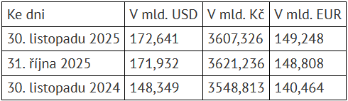 V dolarovém vyjádření rezervy ke konci listopadu meziročně vzrostly o 24,3 miliardy na 172,6 miliardy, meziměsíčně byly vyšší o 708 milionů dolarů. V korunách devizové rezervy na konci minulého měsíce činily 3,607 bilionu korun, meziročně tak byly vyšší o 58,5 miliardy, oproti říjnu ale o 13,9 miliardy klesly.