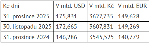 V dolarovém vyjádření rezervy ke konci prosince meziročně vzrostly o 29,6 miliardy na 175,8 miliardy a meziměsíčně byly vyšší o 3,2 miliardy dolarů. V korunách devizové rezervy meziročně stouply o 82,2 miliardy na zhruba 3,628 bilionu korun. Meziměsíčně vzrostly o 19,9 miliardy korun.