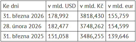 V dolarovém vyjádření rezervy koncem března meziročně stouply o 27,9 miliardy na téměř 179 miliard dolarů, ve srovnání s únorem ale klesly o 3,5 miliardy dolarů. V korunách devizové rezervy činily 3,82 bilionu korun. Oproti loňskému březnu byly vyšší o 332,2 miliardy korun a oproti letošnímu únoru o 70,2 miliardy.