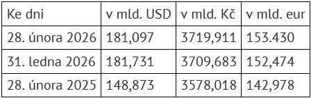 V dolarovém vyjádření rezervy koncem února meziročně vzrostly o 32,2 miliardy na 181,1 miliardy dolarů, proti lednu byly ale nižší o zhruba 630 milionů dolarů. V korunách devizové rezervy činily 3,72 bilionu korun, proti loňskému únoru tak byly vyšší o 141,9 miliardy a proti letošnímu lednu o 10,2 miliardy.
