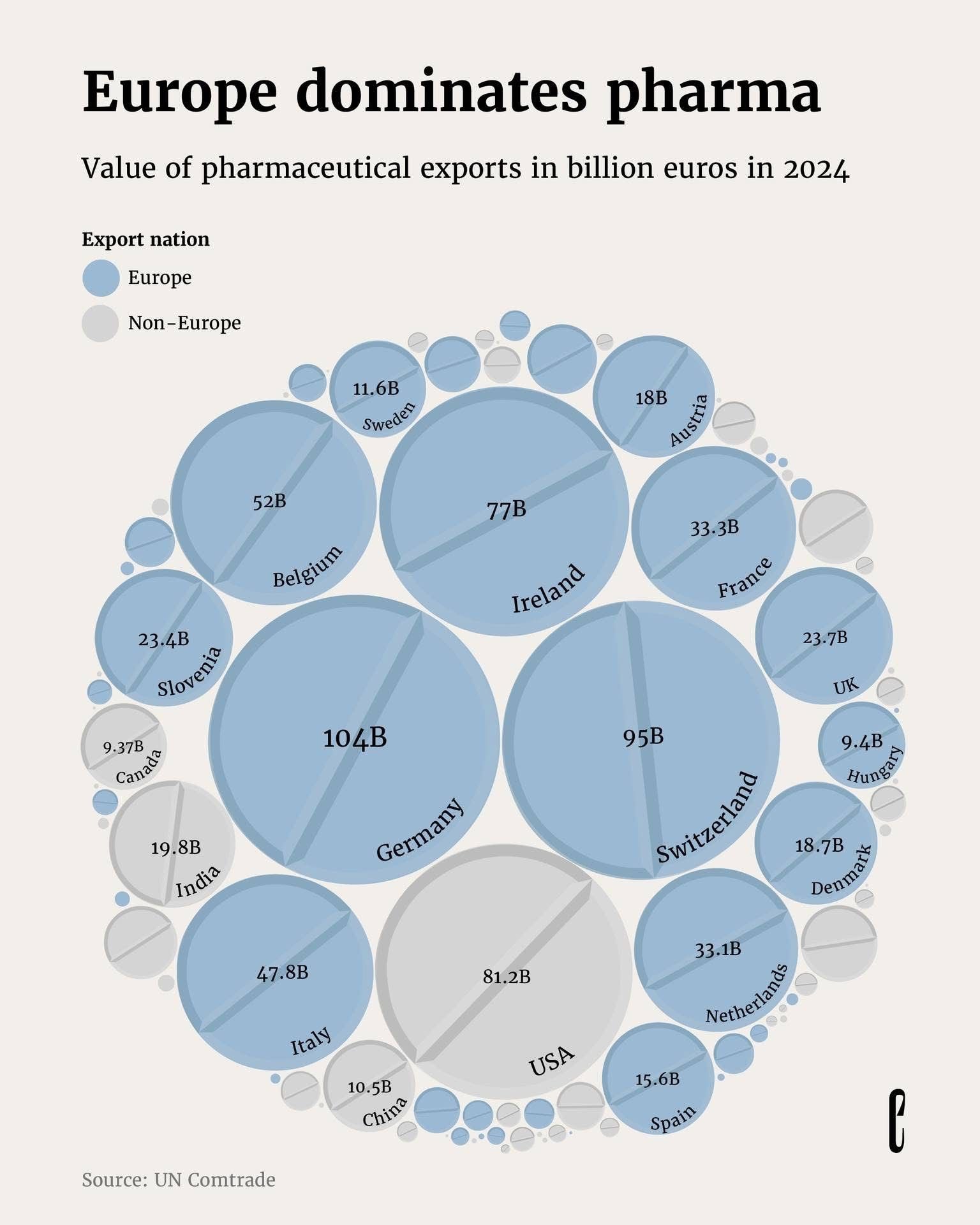 Jednou z mála oblastí, kde je Evropa jednoznačným lídrem a nezaostává za Čínou či USA, je export léků. Ten je v Evropě násobně větší, než ve zbytku světa dohromady.