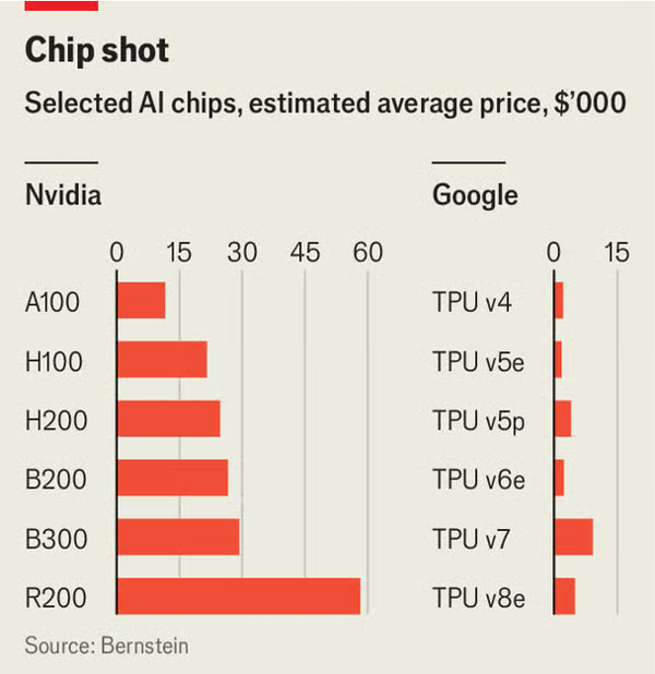 Čipy TPU od Google jsou násobné až řadově levnější, než cipy od Nvidie.