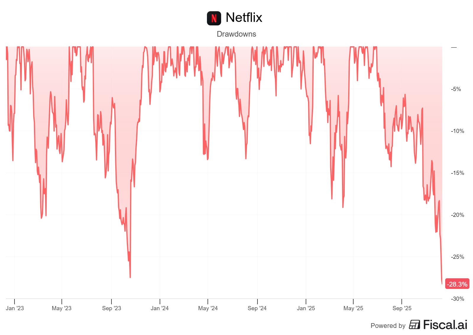 Akcie Netflixu oslabují od vrcholu už o téměř 30 %, což představuje největší korekci od roku 2022.