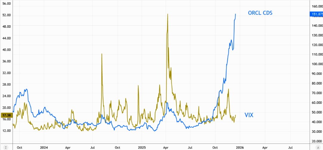 Tady něco nehraje...Propast mezi ORCL CDS 5YR (5letý swap úvěrového selhání společnosti Oracle) a VIX (index akciové volatility) je obrovská.