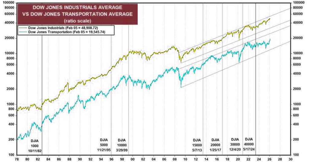 Oba klíčové indexy Dow Jones – průmyslový a dopravní – se drží na nebo poblíž svých posledních rekordů. Podle teorie Dow je to potvrzení, že býčí trh stále nezeslábl.
