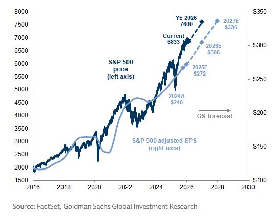 Goldman Sachs odhaduje růst US akciového trhu (S&P 500) na 7 600 bodů pro letošní rok, což je zhruba +12 %. Odhad v podstatě počítá s úměrným růstem earnings byznysů (taky zhruba 12 %), které jsou pro rok 2026 očekávané. Jak jste si ale mohli všimnout, obzvláště akcie softwarových společností dostávají poslední týden nemalý výprask. Z čehož vyplývá, že letošní vítězové budou možná odlišní od toho, na co jsme byli zvyklí v předešlých letech. Pořád jsou to jenom odhady.