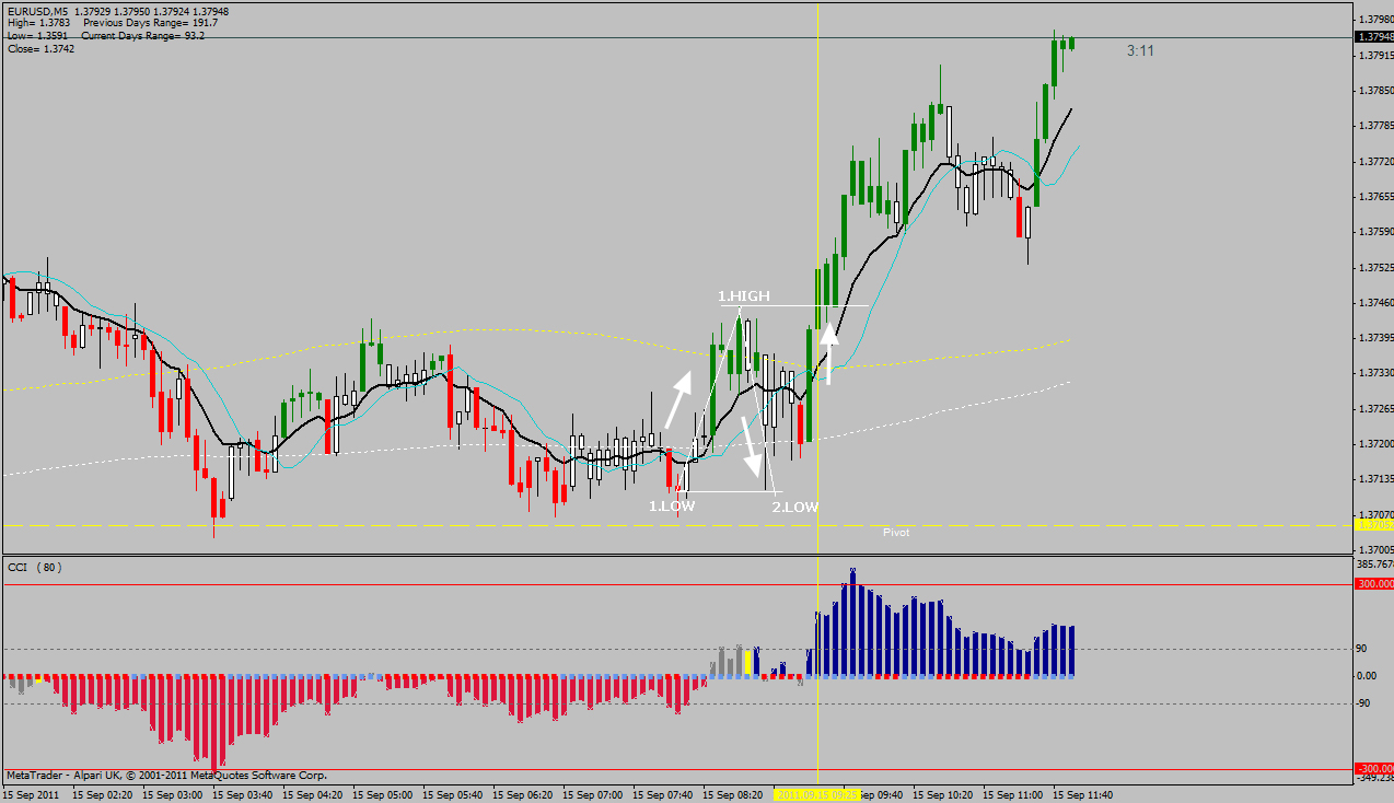 2. jiné vstupy nevyužívám, ikdyž se tam dá vstupovat např.: když svíčky v barvě(RSI Candles protínají v trendu MA 10) a zároveň je splěná podmínka na CCI 90/-90, tak jako dnes v 11:30 a v 15:00, ale já dávám přednopst kvalitě né kvantitě, jde o to, že u re-vstupů se jen těžko hledá nějaký filtr a bavíme se solidní ruletě, kde šance na úspěch je 50/50...dnes byl krásný LONG trend, ale v momentě, kdy půde trh spíše do strany a bude se pohybovat v kanále cca 60pips tak Vás to nemylosrdně strestá...proto beru jen signály na začátku trendu, vezmu si co potřebuji a jdu ven...zítra je taky den :-)