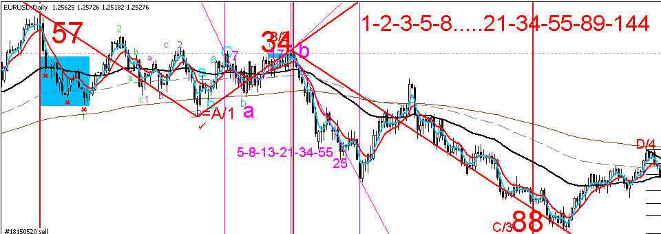Já to mám 59-40-29 , ale to je jedno  , komplexnost postupující korekce je budto vzestupná nebo sestupná. Ty mluvíš o vzestupné, ale tento případ je sestupná, to znamená , z hlediska časua složitosti je zde A nejdelší, B krattší a C nejkratší ( vyjímečně je i B nejkratší) , co se ceny týče, tak u korekce typu roviny , není pravidly jasně definována velikost C vlny, záleží na tom jaký typ roviny to je. Velikost C vlny se může pohybovat od F0.5 do F260 z A vlny popřípadě z B vlny. V tomto případě šlo o prodlouženou rovinu.  C vlna v rovině jak víš je vždy impuls , to jak to máš namalované ty není v druhé části tvé C vlny impuls ( od 27.10.211 je to kombinovaná korekce) , impuls končí v místě, kde mám C označeno já , pak je long CikCak X vlna a pokračuje již zmíněná kombinace short. Počet svíček které každá vlna obsahuje nemusí být FIBO číslo, důležitější jsou časové FIBO poměry vln.