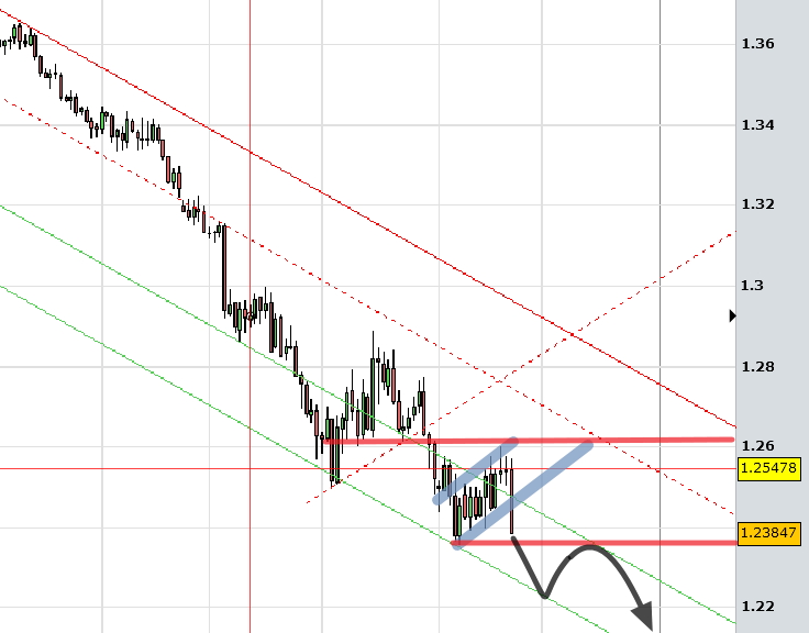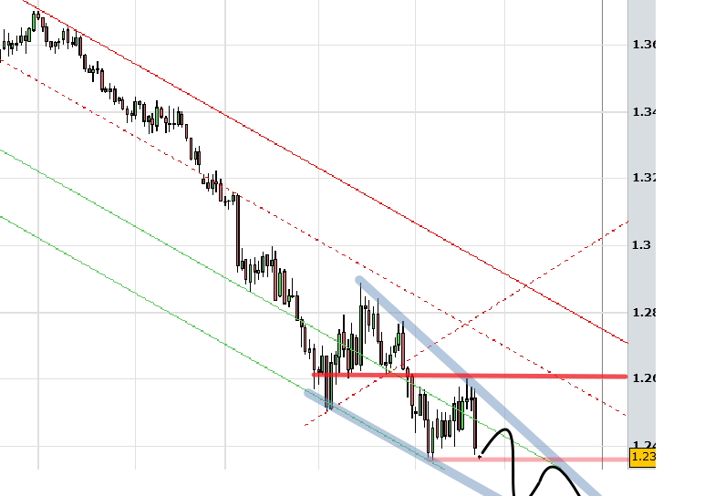 Tak základ je poslední minimum, tj. někam k 1,2360. Pak dál dolů - cíl by mohl být někde u 1,22 - 1,20. Ale tady to už nebude tak o technice jako o ECB - tj. jak moc budou uvolňovat a jak moc chtějí srazit euro.