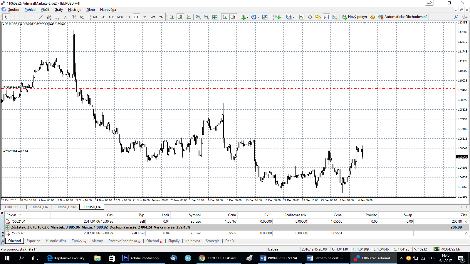 Hmm ja tyto predikce uz davno nedelam. Obchoduji aktualni stav trhu. Podle meho je nyni Euro v kratkodobem shortu, takze jsem v shortu na 1H s PT na 50. Pokud dojde k prurazu 1,06153 /vcerejsi HIGH/ tak akceptuji SL a long necham byt. Do longu bylo treba nastupovat na 4H na cca 1,0437 vcera po prurazu TL v 11,00.