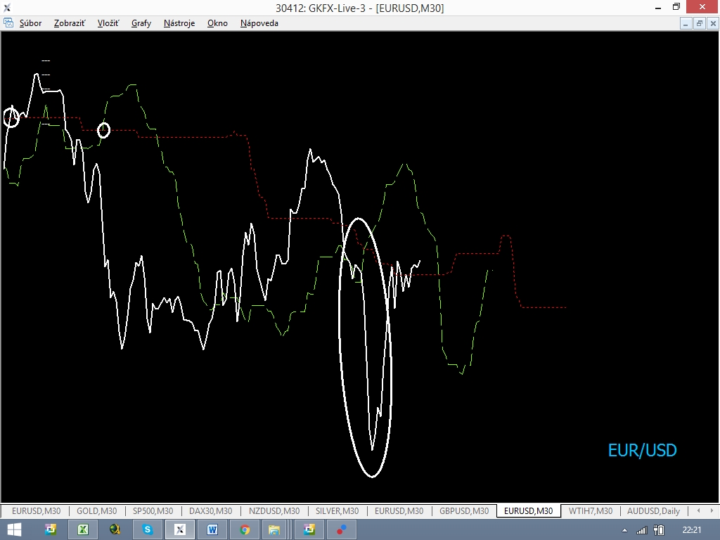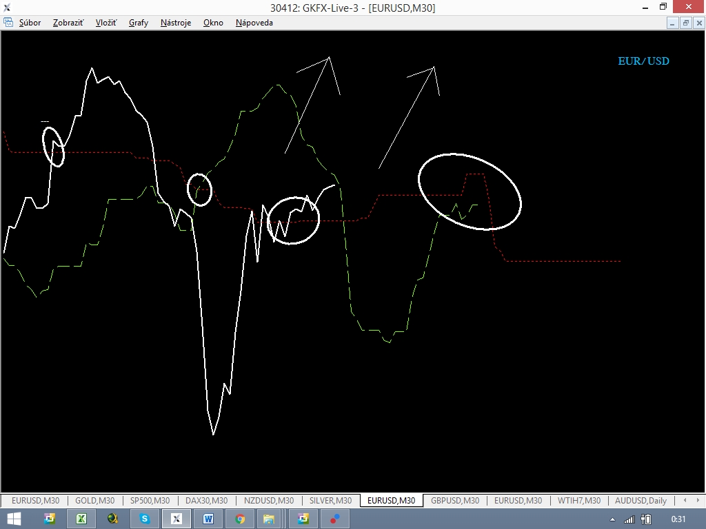 Či že zázračný pokles sa nekoná a sme na úrovni piatka. Ako som vyššie  písal to čo je umelo stlačené vráti sa späť. Momentálne sa pár opäť tlačí do silného signálu rastu, presne ako ráno. Jediný rozdiel je, že sa zakreslil aj signál rastu, ktroý potrebuje korekciu do poklesu. Ráno to vyzeralo ideálne, kedy mal opár robiť korekciu do rastu, bol tam slabý signál 126 a navyše sa zakreslil silný signál N3. Všimol som si že aj známe signály MT4 podporovali rast a aj to mohol byť dôvod, prečo sa posledný signál nepotvrdil a tesne po potvrdení pár začal prudko padať. Niekto tu síce tvrdí že to bolo technické, no tak schválne, o akú techniku poklesu išlo? O techniku rovná čiara?