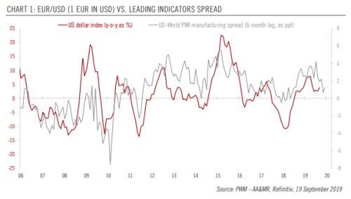 Pictet podle svých aktuálních projekcí očekává, že za euro se bude za tři měsíce platit 1,1 dolaru, za půl roku 1,13 dolaru a za rok 1,14 dolaru. V následujícím grafu společnost porovnává vývoj dolarového indexu s vývojem spreadu mezi PMI amerického výrobního sektoru a PMI globální ekonomiky.