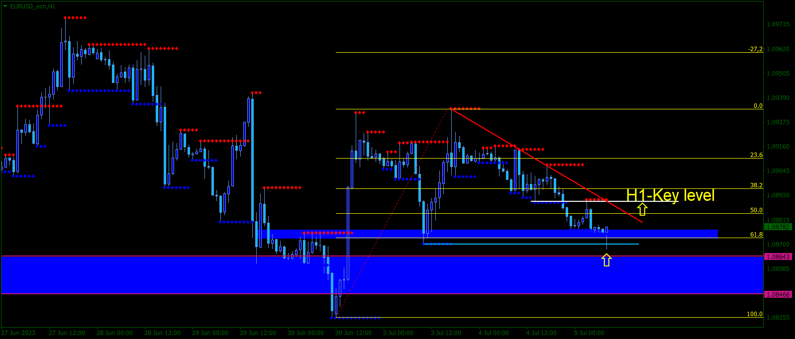 H1- Agresivní obchodníci mohou hrát falešné proražení dna pomocí Outside baru ve tvaru Pin baru. Rozvážní obchodníci mohou počkat na break vyznačeného H1-Key levelu.