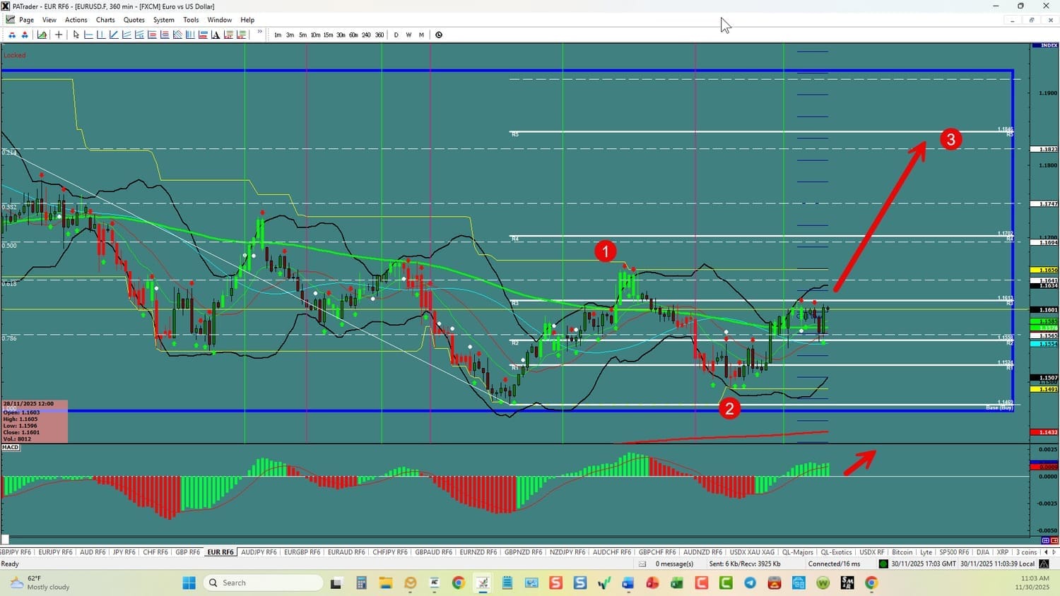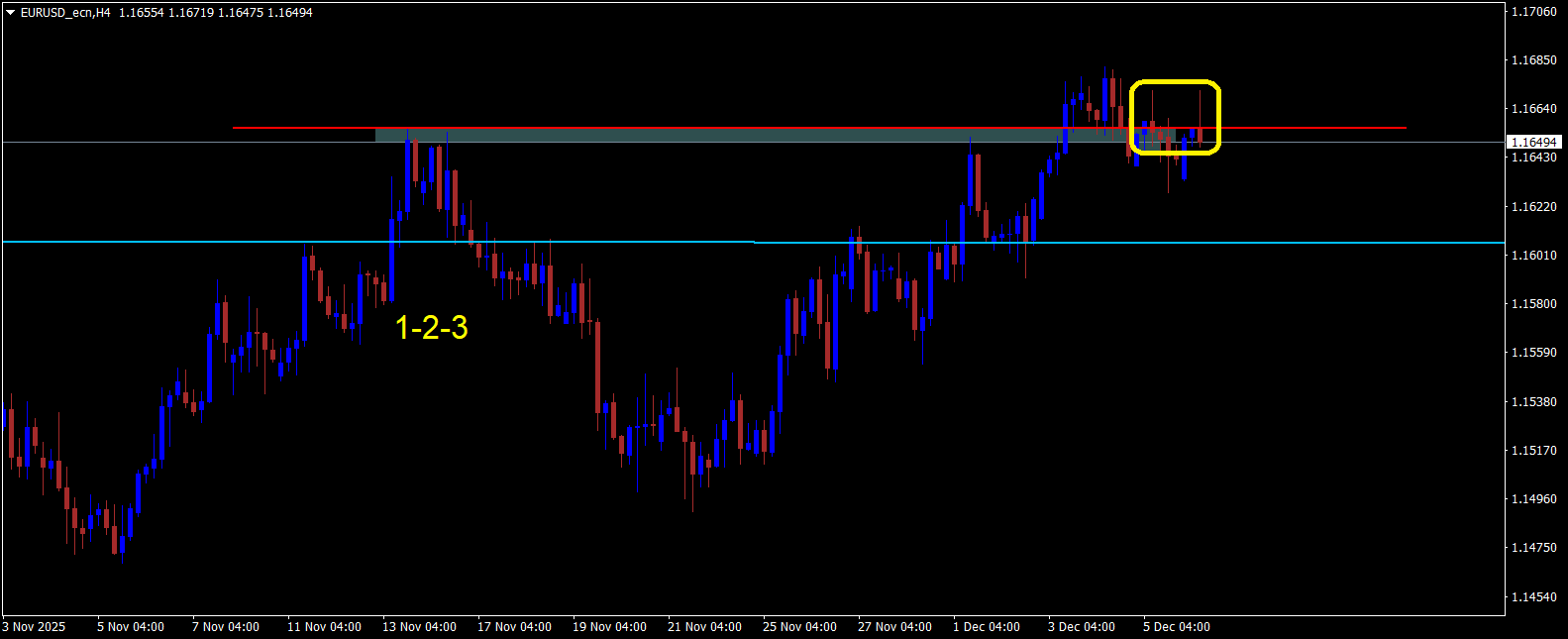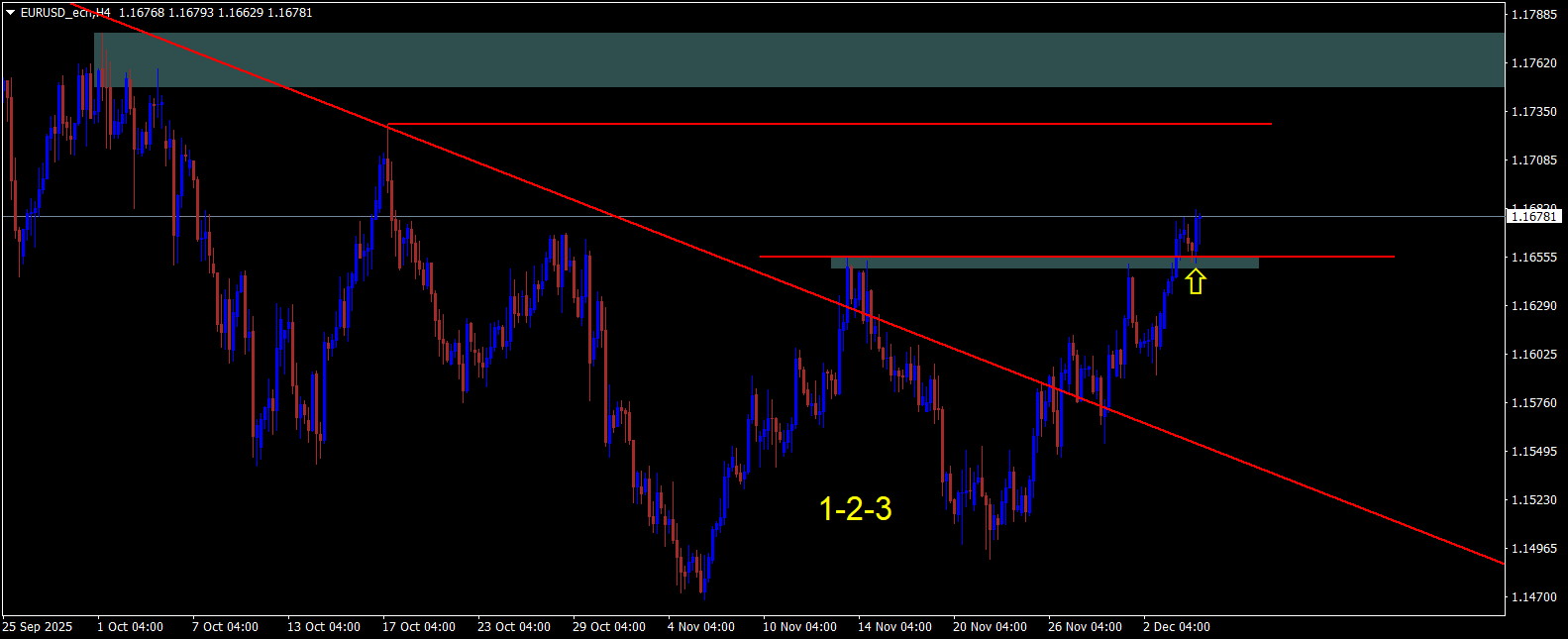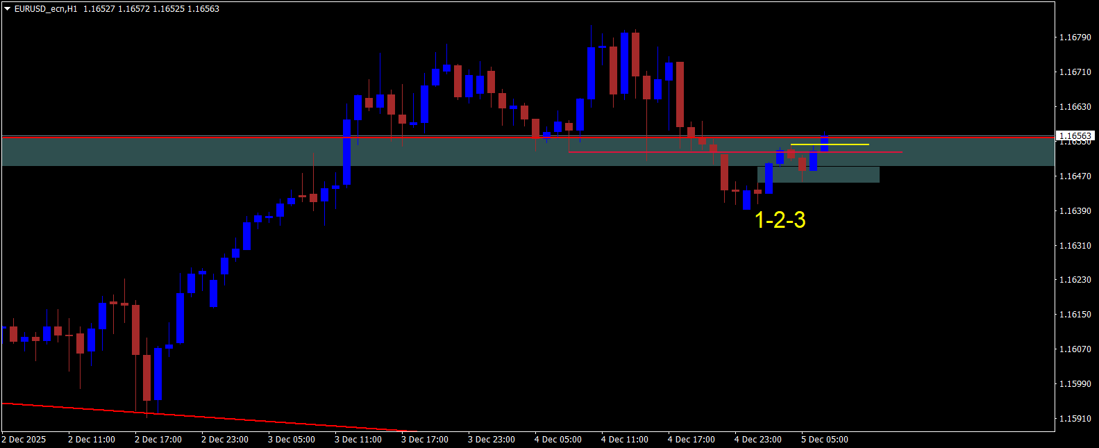 Medvědí Outside bar- reakce na trendovou čáru+ Order block. Aktuální svíčka na H1 může potvrdit na tomto časovém rámci aktivaci reverzního patternu 1-2-3.