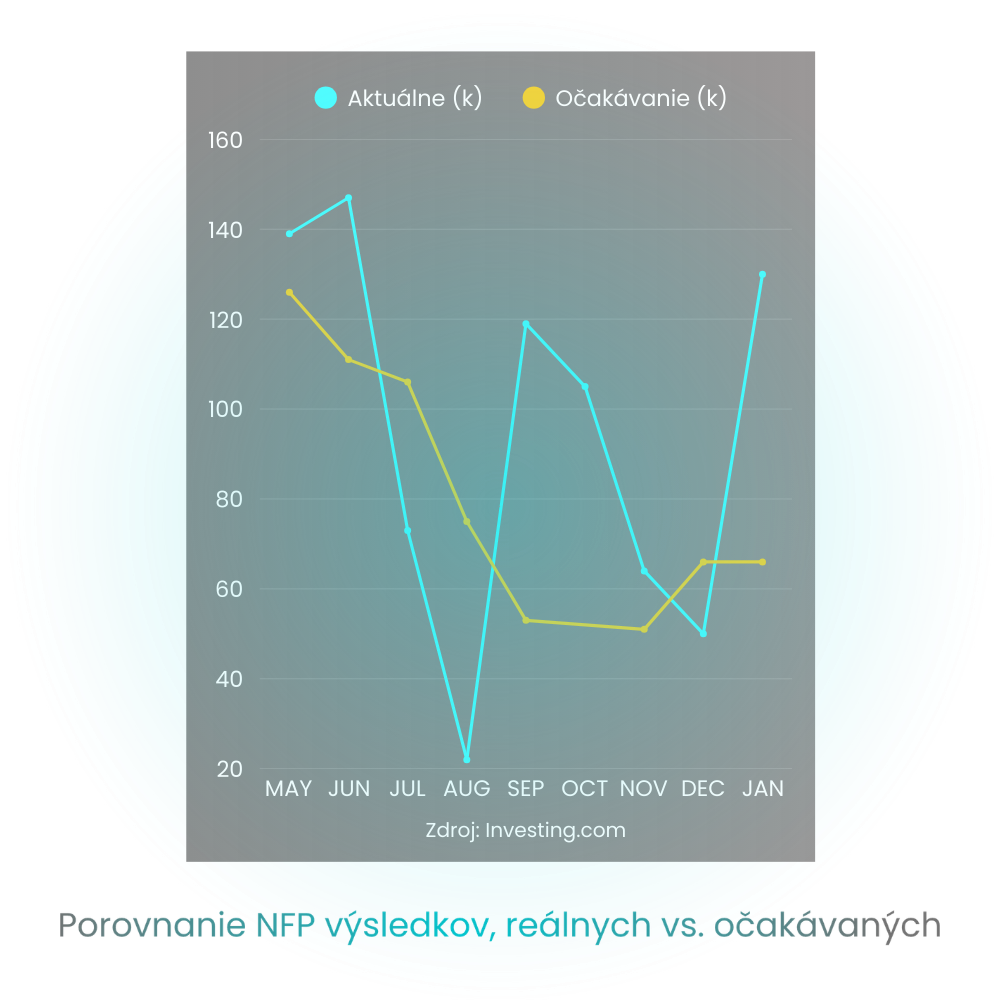 Všimnite si na grafe, časté významné rozdiely medzi reálnymi výsledkami NFP a očakávanými výsledkami. Čím väčší rozdiel býva, tým je reakcia trhu významnejšia.