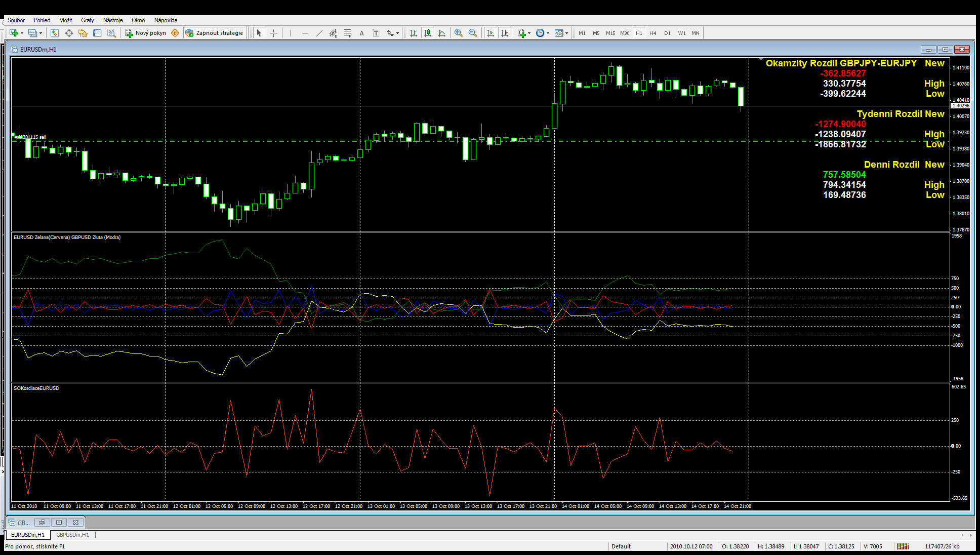 Dík za odpověď, jestli chceš zkus si dát na Day (H4) MACD  přednastavené 12,26,9 a k tomu druhý a ten si nastav 5,34,7, křivka na prvním je nahoru, na druhým dolu, trochu si ho tím zrychlíš a rozdíl predikuje možný vývoj, na H4 uvidíš na svících že druhá verze je schopna daleko dřív predikovat možné div, snad Ti to k něčemu někdy bude, Barva