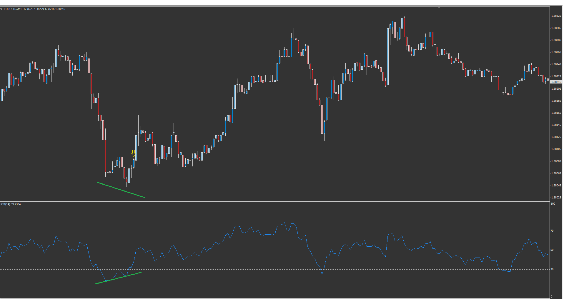Tak si vieš porovnať akú silu má M1 TF. Na M1 by si vstúpil na cene 1,38091 a na M5 na cene 1,38163. Takže keby si na M5 vstupoval, tak na M1 už by si mal 7,2 pips zarobené.