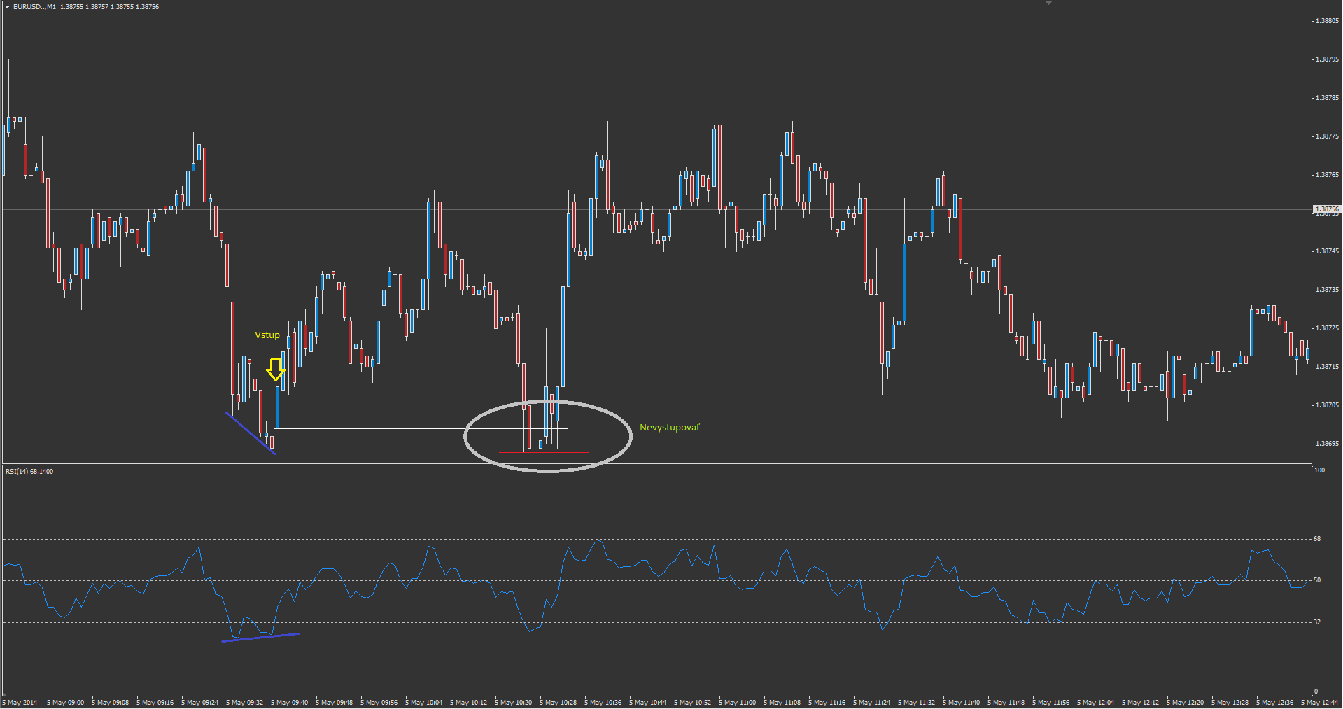 První dno divergence 1.38702(vodorovná žlutá), vstup 1 pip nad dnem - 1.38712(vodorovná červená), TP 5 pips - 1.38762(oranžová linka). Já mám high té svíce, kde bych ukončil obchod na 1.38766.