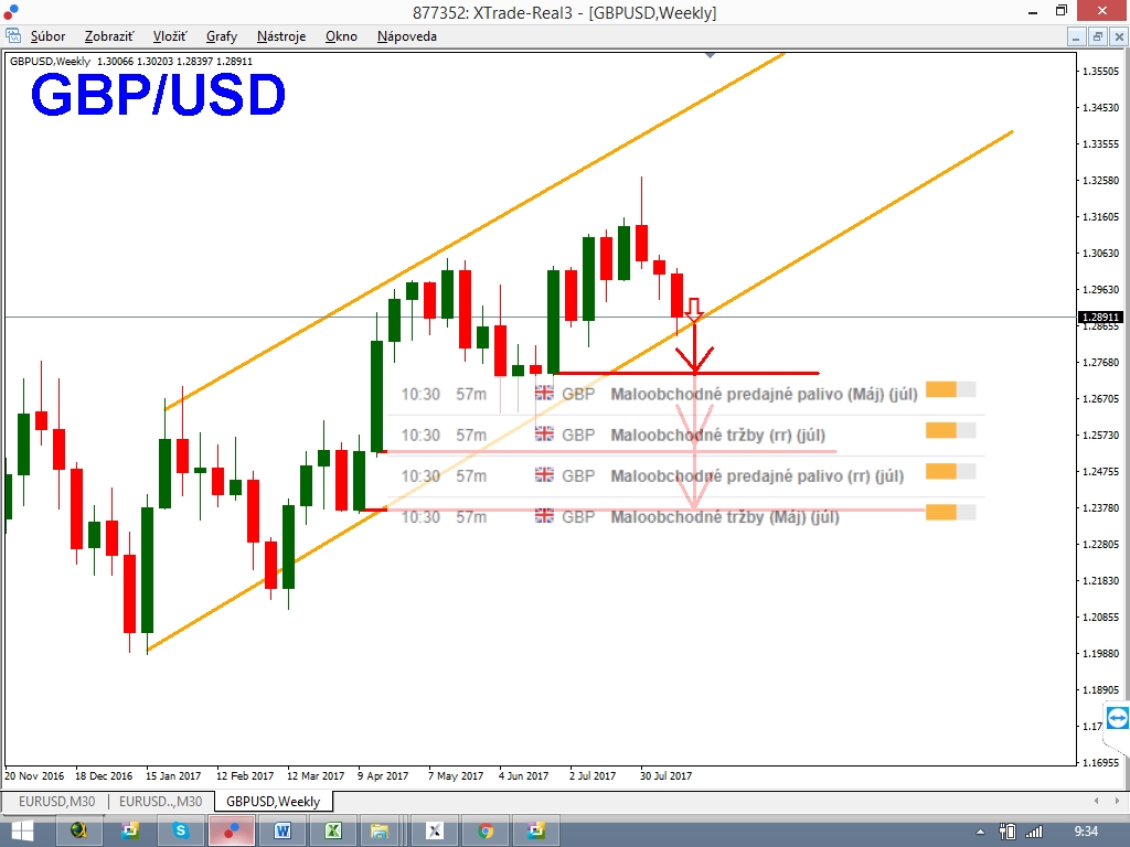 Opäť považujem oslabenie páru za nedostačujúce. Napriek pozitívnym správam pre GBP, libra musí technicky oslabiť. Pozitívne správy iba oddialia pokles páru. V grafe ukazujem ako by to asi malo vyzerať . Pokles na páre by mal byť oveľa drastickejší, ako by sa mohlo zdať a úroveň grafu by mala dosiahnuť 1,27-1,24.