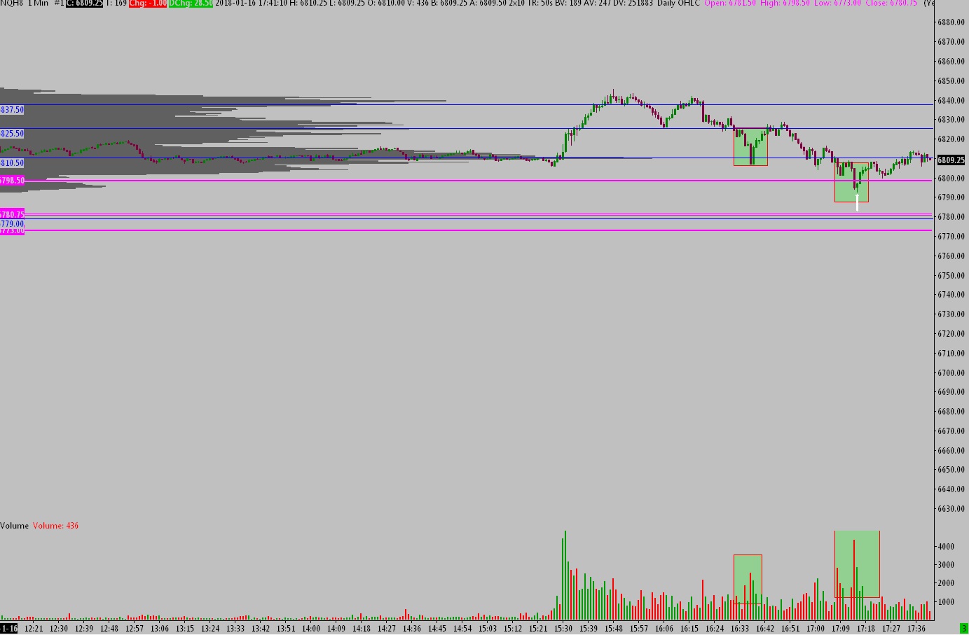 Situace je označená obdélníkem, popis myšlenkových pochodů - úroveň 6810,5 byla do té doby výrazně nejvyšší hodnota rezistence, proto když k ní trh takto klesnul, tak i označené volume mi říká, že se tam stal výprodej. Tzn., měl jsem v plánu vstupovat do LONG pozice na vhodné reverzní svíci, která se ovšem vůbec neobjevila. Trh hned po odrazu od hodnoty vystřelil nahoru a vhodné místo pro vstup nebylo. Párkrát už jsem vstoupil hned po obratu na nereverzní svíci, ale standardní postup to není a tady se mi to vzhledem k velkému rozpětí moc nelíbilo. Každopádně situace určitě dobrá a v případě reverzní svíce bych vstupoval.
