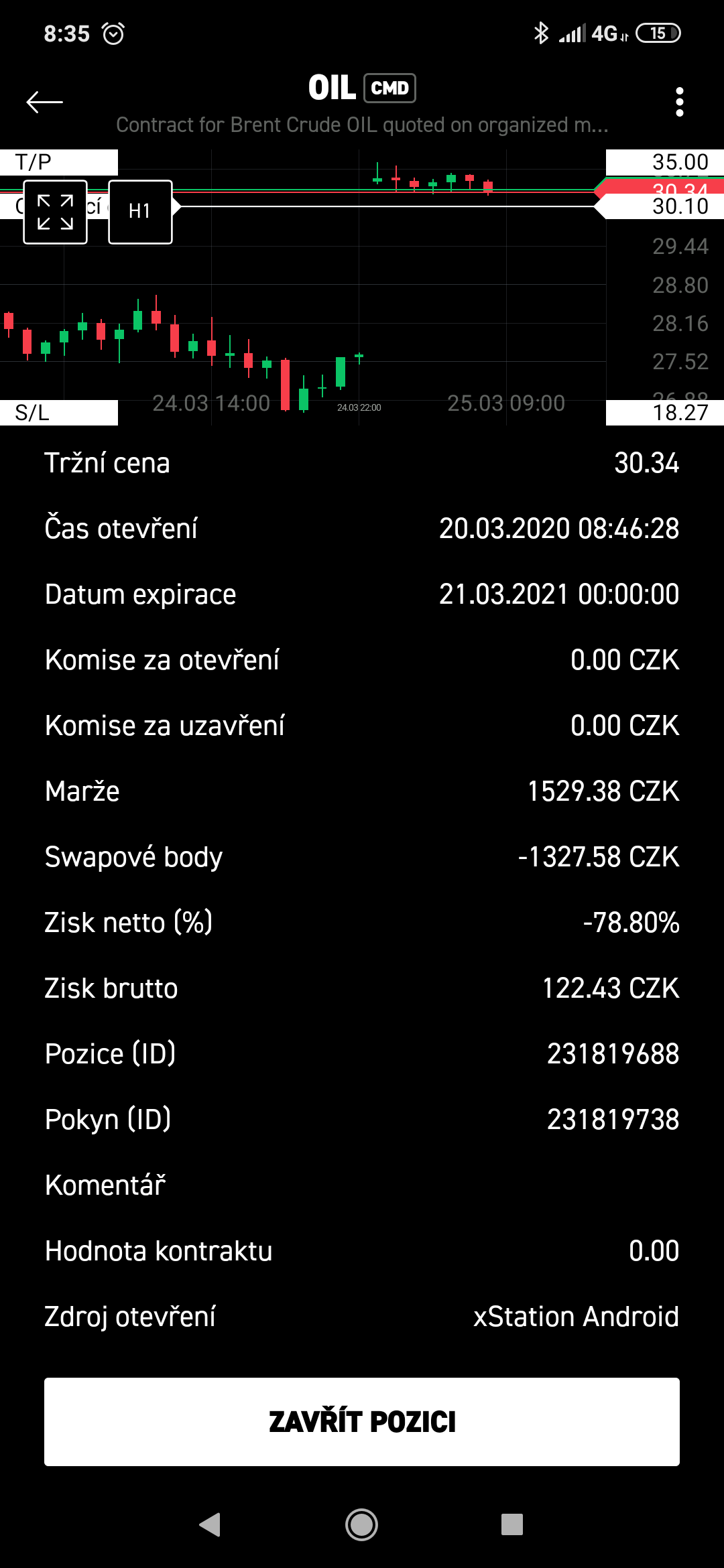 pokud tam nemáš započítaný swap, tak jsi otevřel pozici nejdřív 25.3., což už bylo po tom velkým gapu. Rollover byl 24.3., příští bude 21.4.