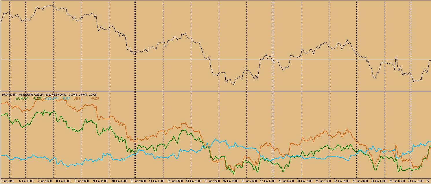 vo vlákne, na ktoré som sem dával odkaz je indikátor, ktorý zobrazuje v jednom okienku čiary stochov dvoch párov a diferenčnú krivku medzi nimi, teda celkom 3 čiary. Možno by sa ti to hodilo.