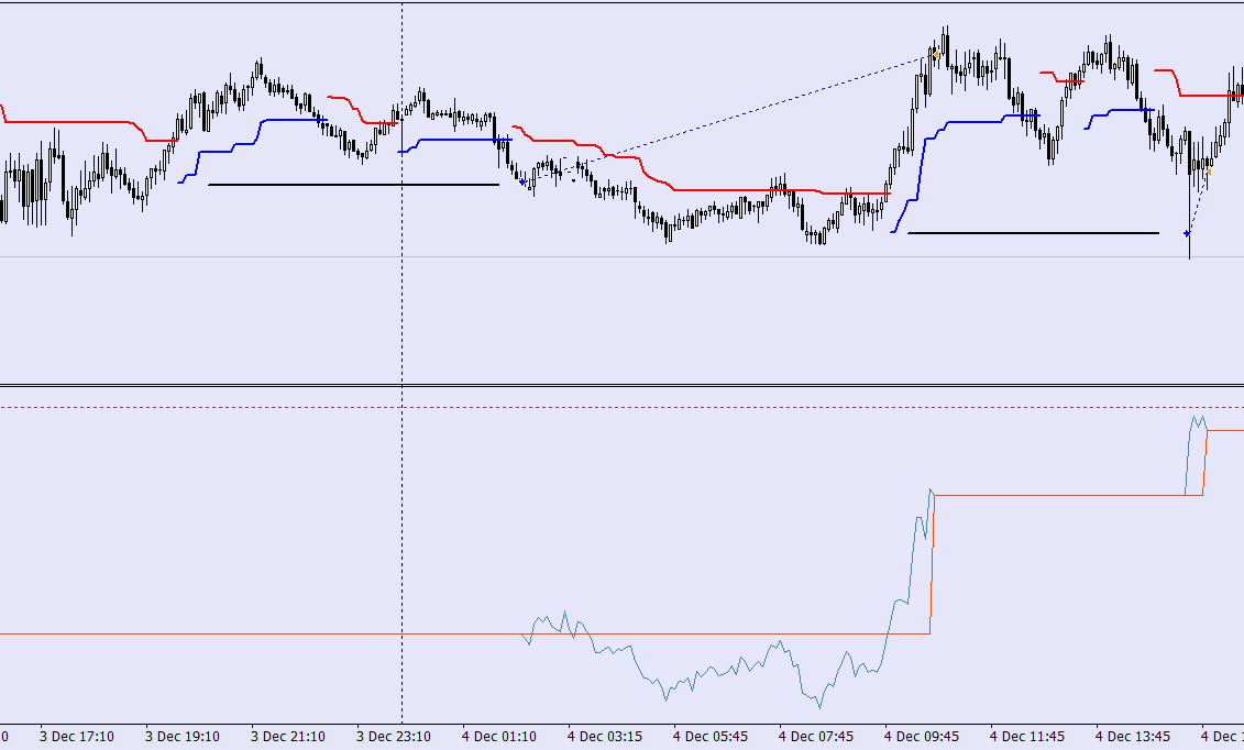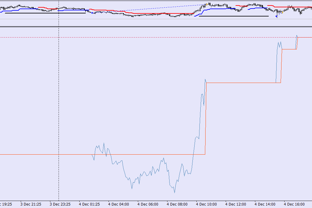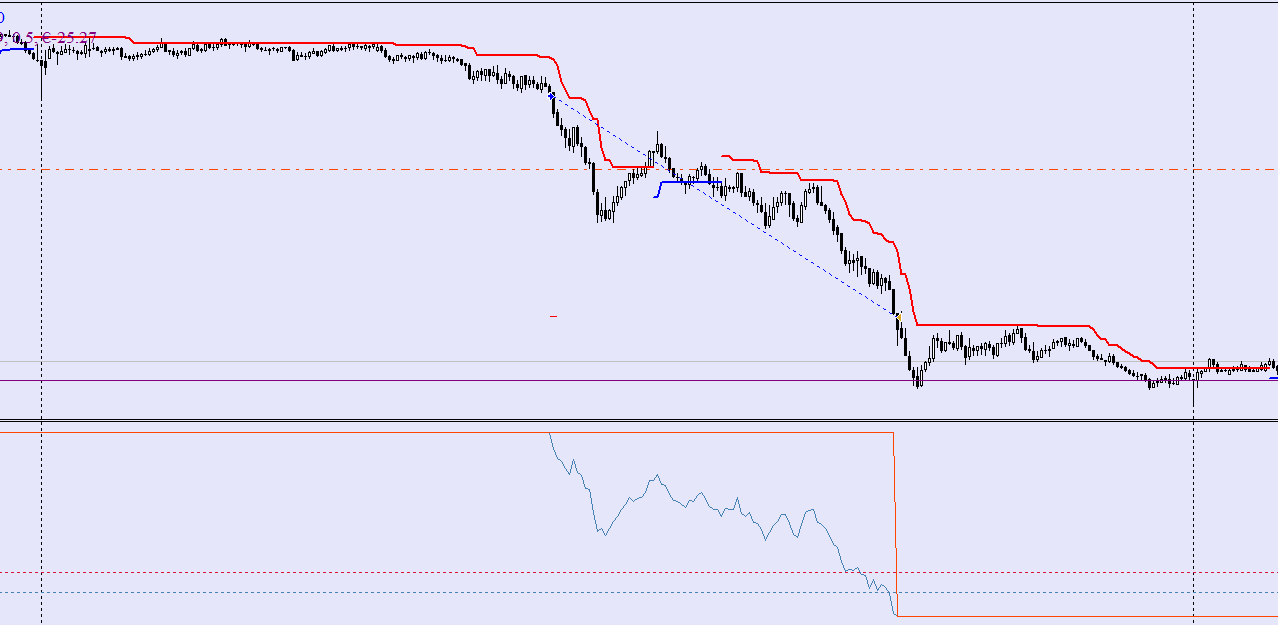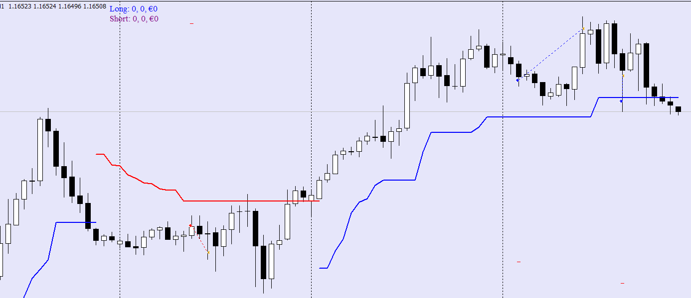 Obchodujem tieto menové páry: AUDUSD, EURUSD, USDCHF, NZDUSD, USDCAD, GBPUSD, EURGBP a AUDNZD. Na dennom grafe si najprv rozdelím graf na obdobia rastu a obdobia poklesu pre každý menový pár osobitne. Napríklad pre EURUSD je rozdelenie podľa nasledujúceho obrázka. Trendy určujem pre všetky obchodované páry rovnakým spôsobom. Potom si na H1 grafe zvolím vstupné čiary, kde môže byť otvorená pozícia. Ak je na D1 trend nadol, môžu byť otvorené iba sell pokyny, ak je na D1 trend nahor, môžu byť otvorené iba buy pokyny. Riadim sa výlučne podľa volatility, neberiem do úvahy žiadne zóny alebo formácie. Veľkosť pozície mám momentálne pre každý pár danú rovnakým počtom lotov. Teda páry s menšou hodnotou pipu a s menšou volatilitou majú vo výsledku slabšie zastúpenie ako páry viac volatilné a s vyššou hodnotou pipu. Na jednom páre môže byť otvorených aj viac pozícií v tom istom smere. Ich minimálna vzdialenosť je počítaná podľa volatility daného páru ako priemer za 100 uplynulých dní. Snažím sa, aby maximálny prepad na equity zostával pod 5 %. To dosahujem vhodnou voľbou veľkosti pozícií, vzájomným vykrývaním jednotlivých párov a ako aj limitovaním expozície v jednom smere. Pre jednotlivé pokyny nie je zadaný PT ani SL. Zatváranie sa vykonáva na základe priebehu celkovej equity a podľa volatility jednotlivého páru. Nabudúce ukážka, kedy sa otvorila pozícia.