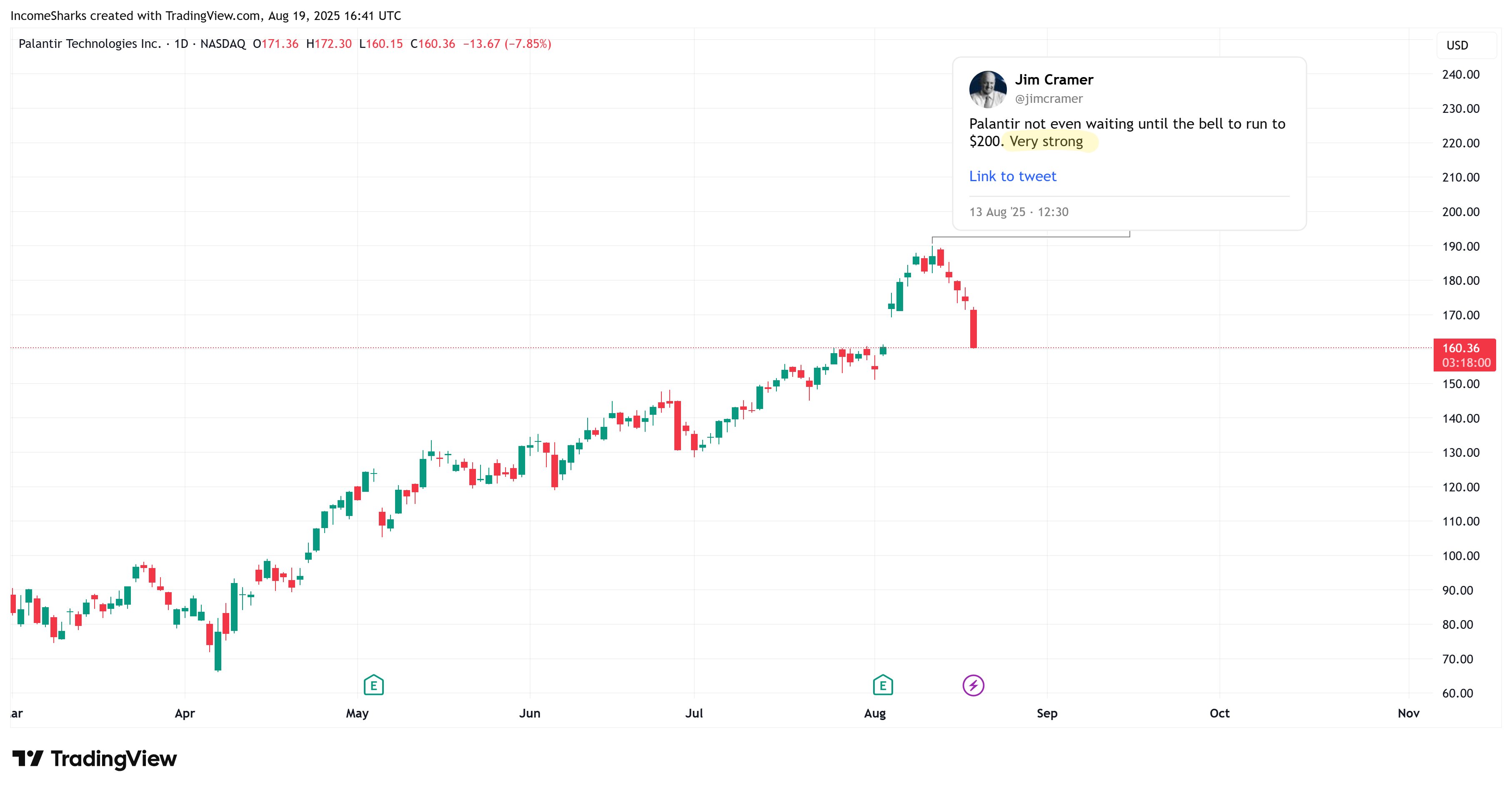 Palantir klesl o 24,6 % od doby, kdy Jim Cramer řekl, že akcie půjdou na 200 dolarů.