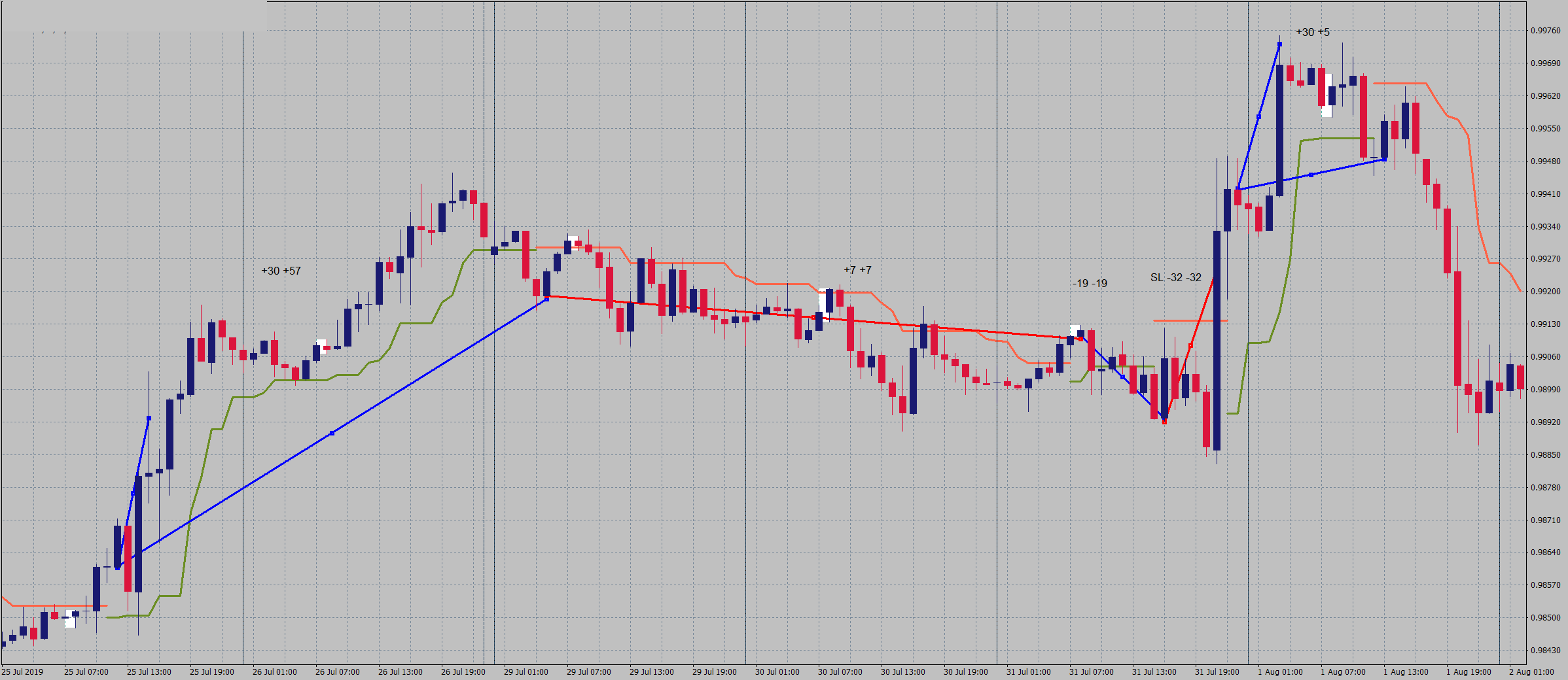 Výstup: Pre obe pozície SL o veľkosti 1/2 ADR10 Pre prvú pozíciu PT o veľkosti 1/2 ADR10 Pre obidve pozície výstup pri zmene trendového indikátora, ak nebol dosiahnutý SL ani PT prvej pozície