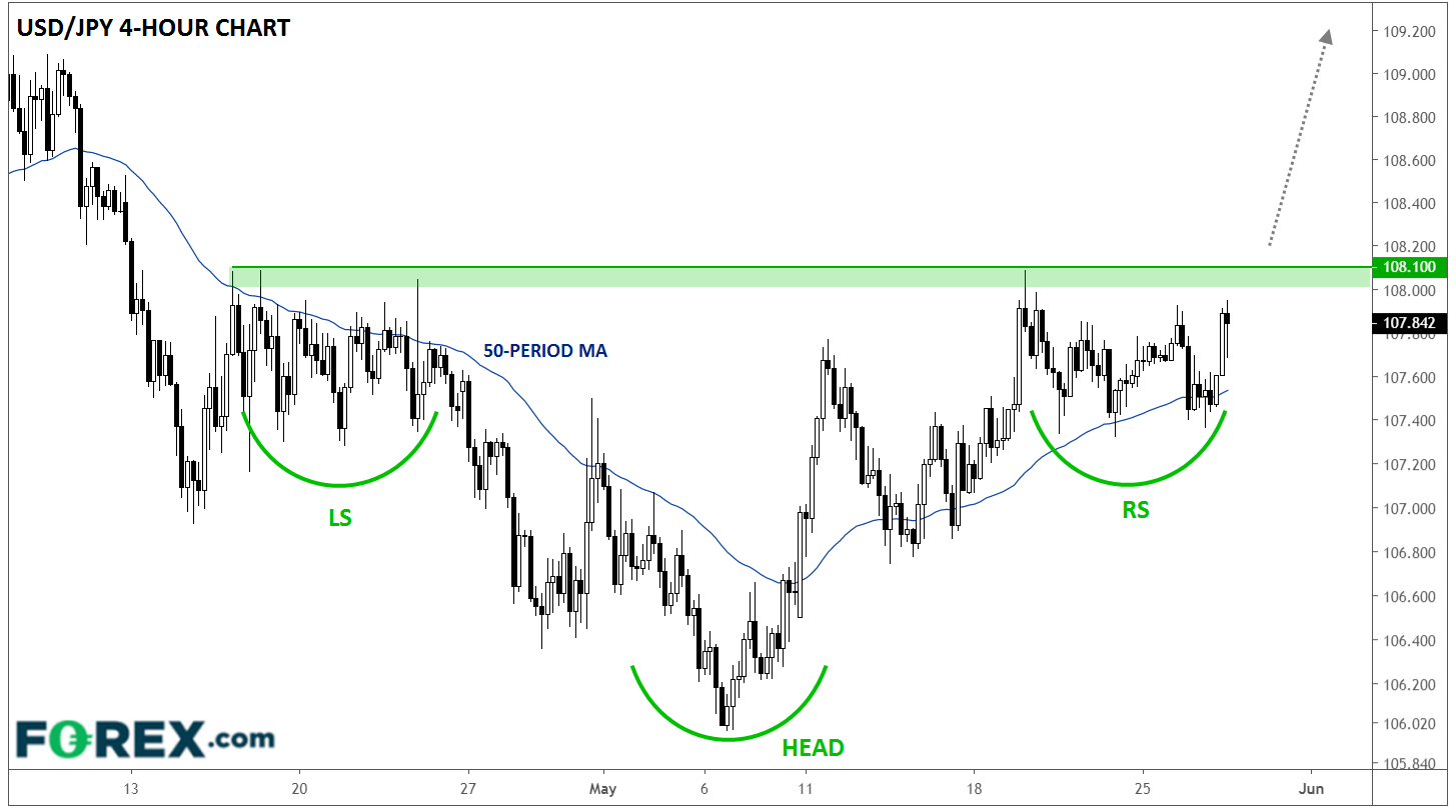 Formace obrácená  Hlava a ramena na USD/JPY. Je tam potenciál dalšího růstu.