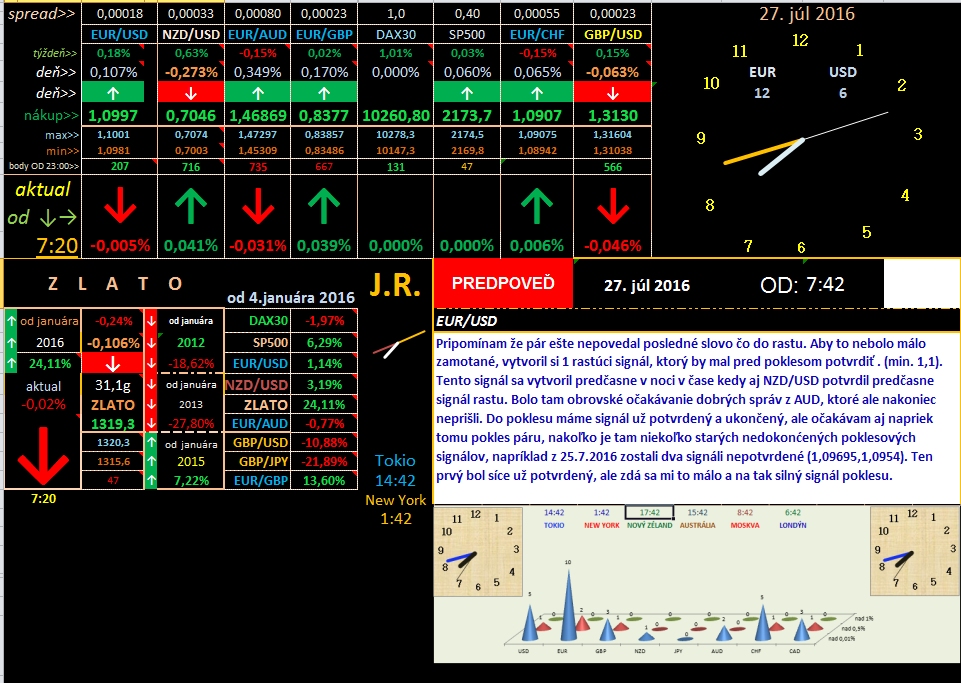 Takže když to shrnu dnes 27.7.2016 v 15:14, říkáš že půjdeme dolů, cena je v tomto čase  cca 1,1000.  Takže řekni kam půjde, pač pohyb dolů 100 pips není pohyb ale denní range kde je to 50:50. Takže asi tak.