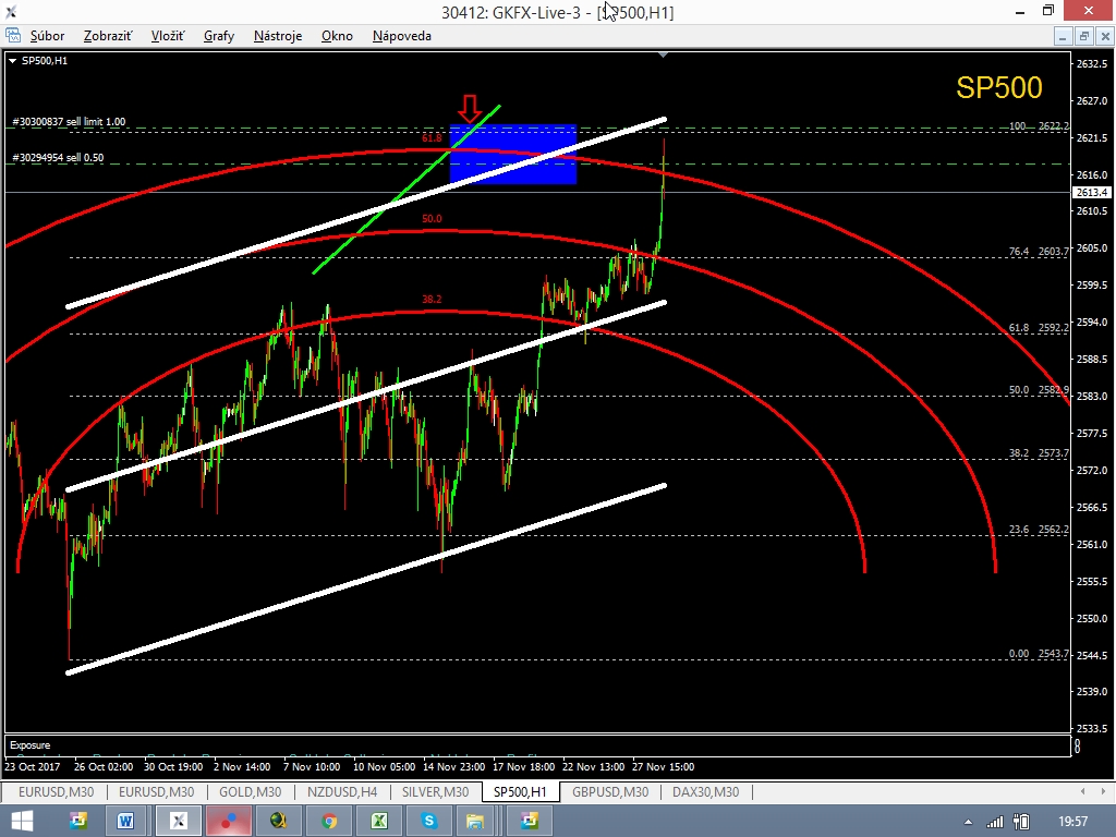 Index stále nedosiahol hranicu 2600. Je psychologická hranica a jedna z posledných v histórii tohoto paškvilu. Indexy budú mať zlú históriu. Dnes sa ešte dočitame, aké sú geniálne ziskové, firmy spadajúce pod SP500. Nikto nevie dňa, ale každý normálny obchodník vie, že ten deň je blízko. Zopakujem si predaj, dávam si paškvil separé, aby sa mi nezavrel v žiadnom prípade. Budem postupovať ako naposledy a teda o chvíľku predám 0,5 lota. Tento obchod nezavriem a ani ho nebudem zachraňovať. Počkám si až sa vyškriabeme na druhú úroveň, kde už mám predaj 1,5 lota. Tento obchod, ak bude treba zahránim, ale určite dlho nezavriem, ak by začal padať. Pokiaľ by sme rástli zavriem obchod 1,5 lota v zisku pomocou protiobchodov a hneď predám vyššie. 0,5 lota už  nezavriem až kým sa nedostane do zisku a nezostane mi otvorený ešte jeden predaj 1,5 lota vyššie.