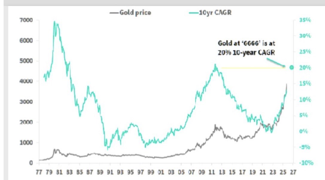 Ďábelských 6666: Zlato většinou naráží na strop, když desetiletý anualizovaný výnos vytáhne na 20 %.