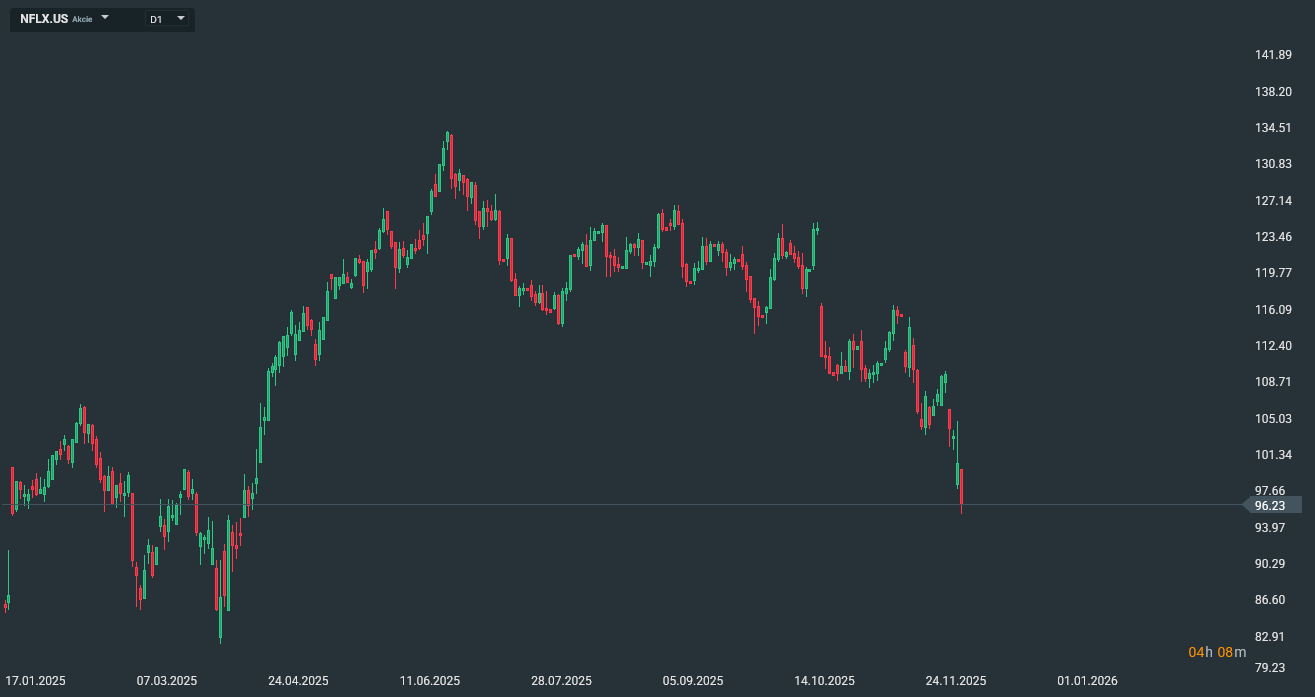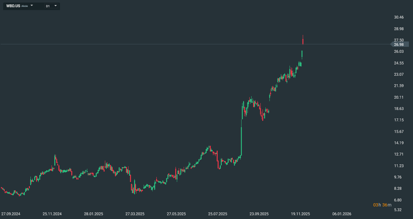 Vývoj akcie Warner Bros. Discovery (denní graf – D1):