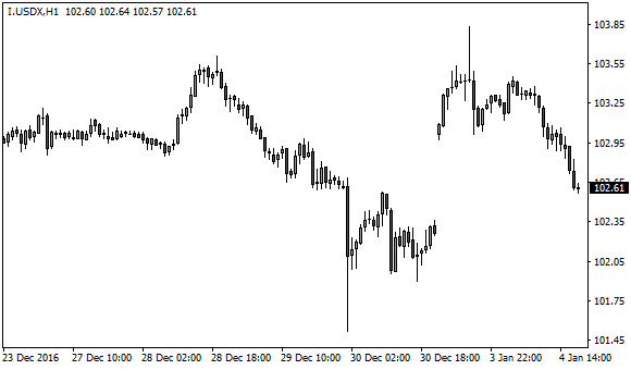 Vývoj dolarového indexu USDX (1hodinový graf - H1):