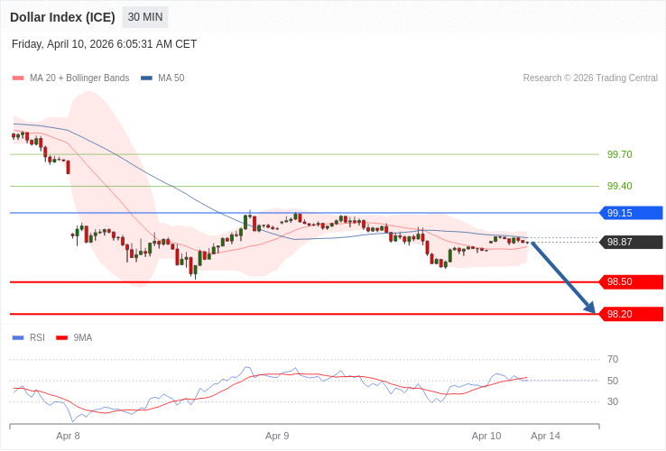 Preferovaný scénář: Krátké (short) pozice pod 99,15 s cílem na 98,50 a dále pak až na 98,20.