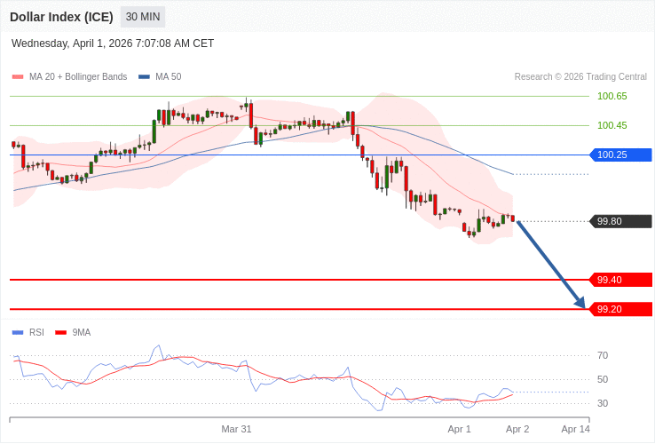 Komentář: Průraz pod hladinu 100,25 je negativní signál, který by mohl umožnit pokles směrem k hladině 99,40.